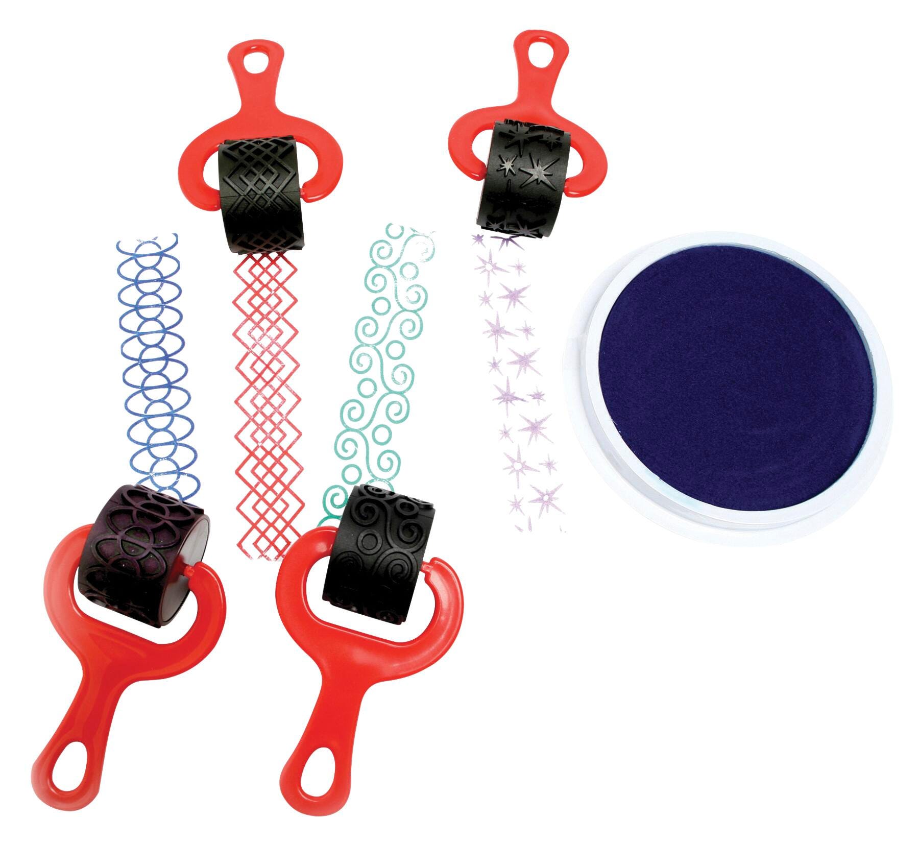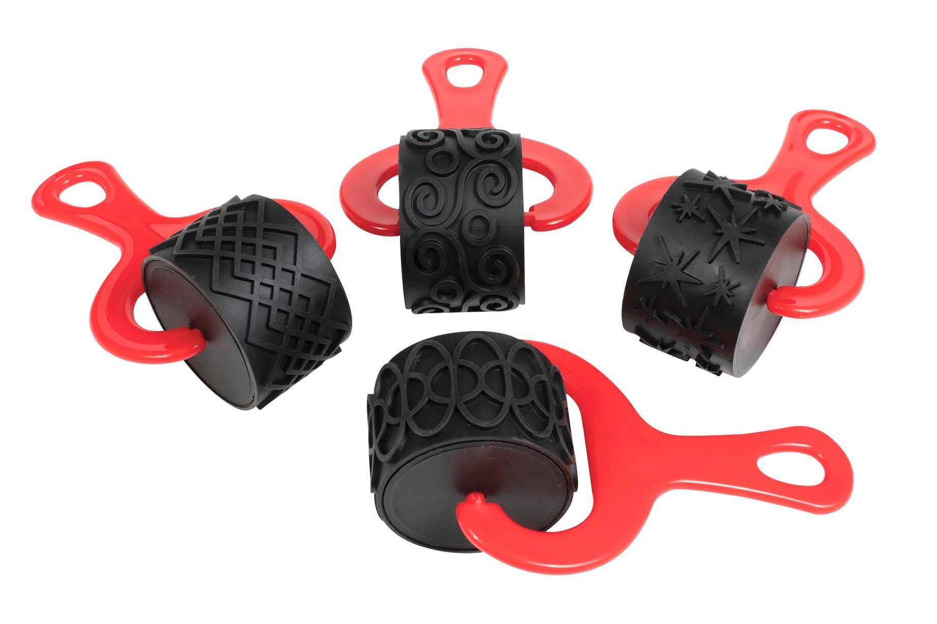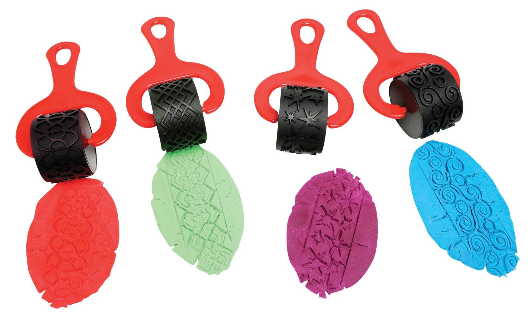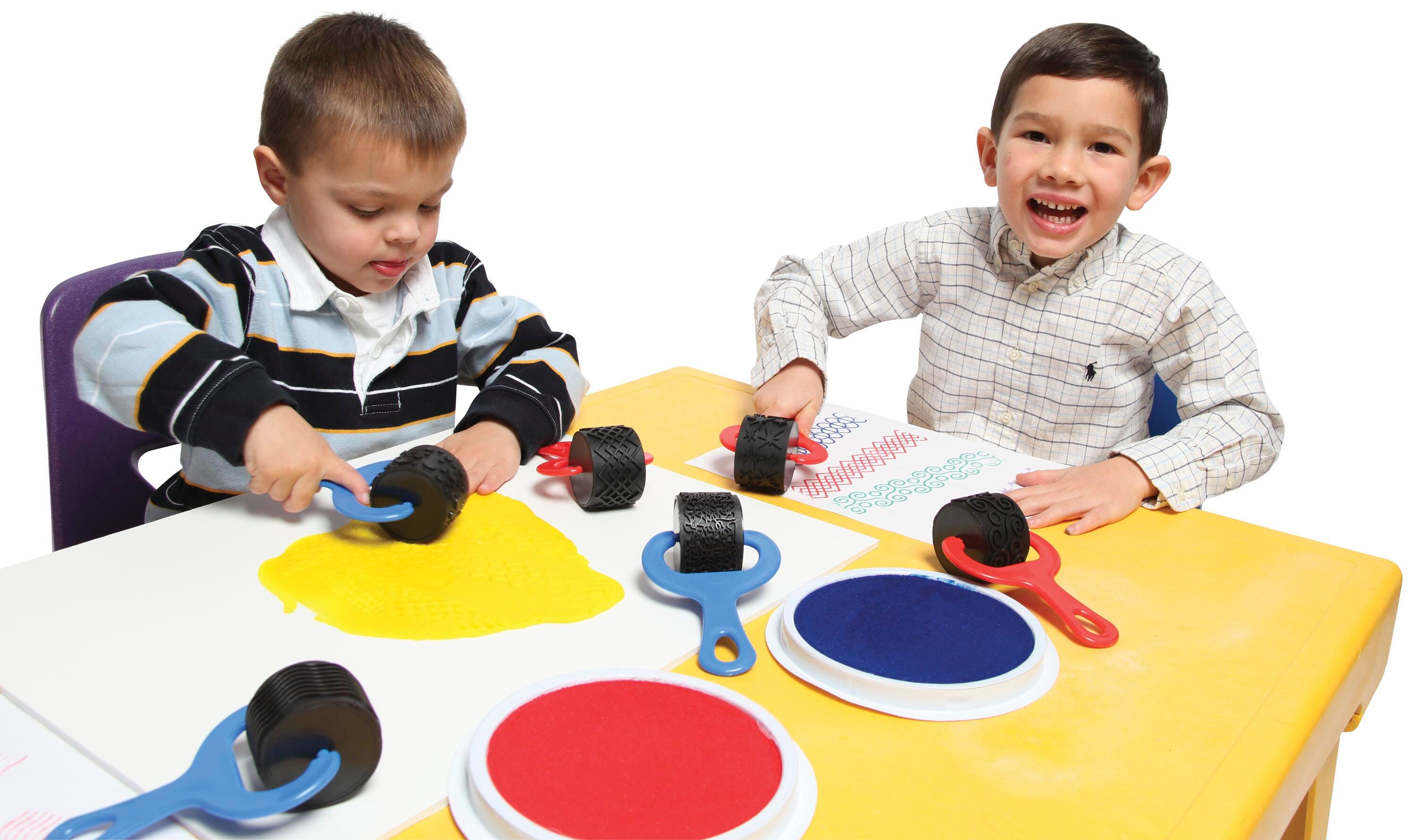 Ready2Learn Paint and Clay Explorer Set contains 1-1/2 in wide heavy duty rollers with 5 in durable plastic, comfort-grip handles for creating unique patterns with paint or clay. Roller contains latex and is easy to clean allowing for child-safe, long term use. Set 0f 4 rollers comes in stars, hoops, swirls and diamond patterns. Sold as 4 per set.
