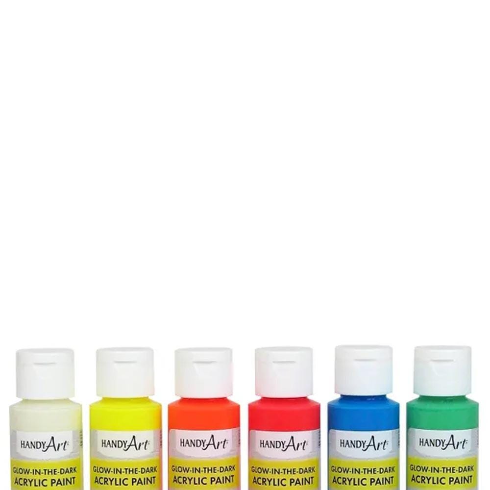 Description Handy Art Glow in the Dark Acrylic Paint Set in assorted color comes in 2 oz capacity bottles. Kit includes 6 different colored paints namely clear, yellow, orange, red, blue and green. Non-Toxic paint adds fun and an eerie glow to your craft and paint projects.Features Available in clear, yellow, orange, red, blue and green AP certified