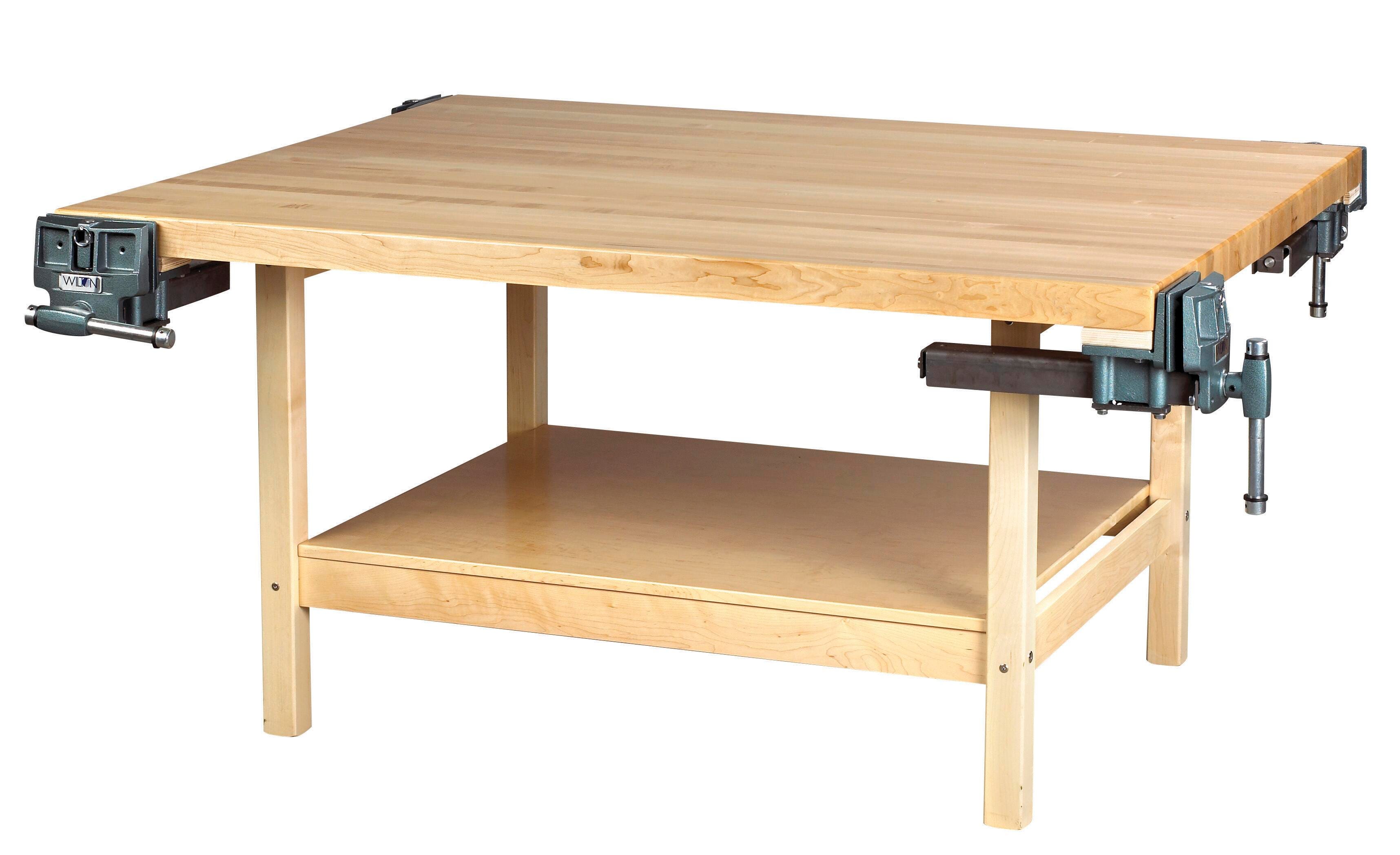 Diversified Spaces Forum 4 Vice Workbench measures 64 W x 54 D x 31-1/4 H Inches with a 2-1/4 inch thick top. The base is constructed from solid maple and maple veneer. The solid maple measures 64 W x 54 L x 2-1/4 H inches. The wood is finished with a durable chemical resistant, non-emitting UV finish. This workbench has a large work surface and plenty of open storage space on the maple plywood lower shelf. The solid legs measure 2-1/4 W x 2-1/4 D inches. The vice jaws measure 7-1/2 W x 3-1/2 H inches.Features