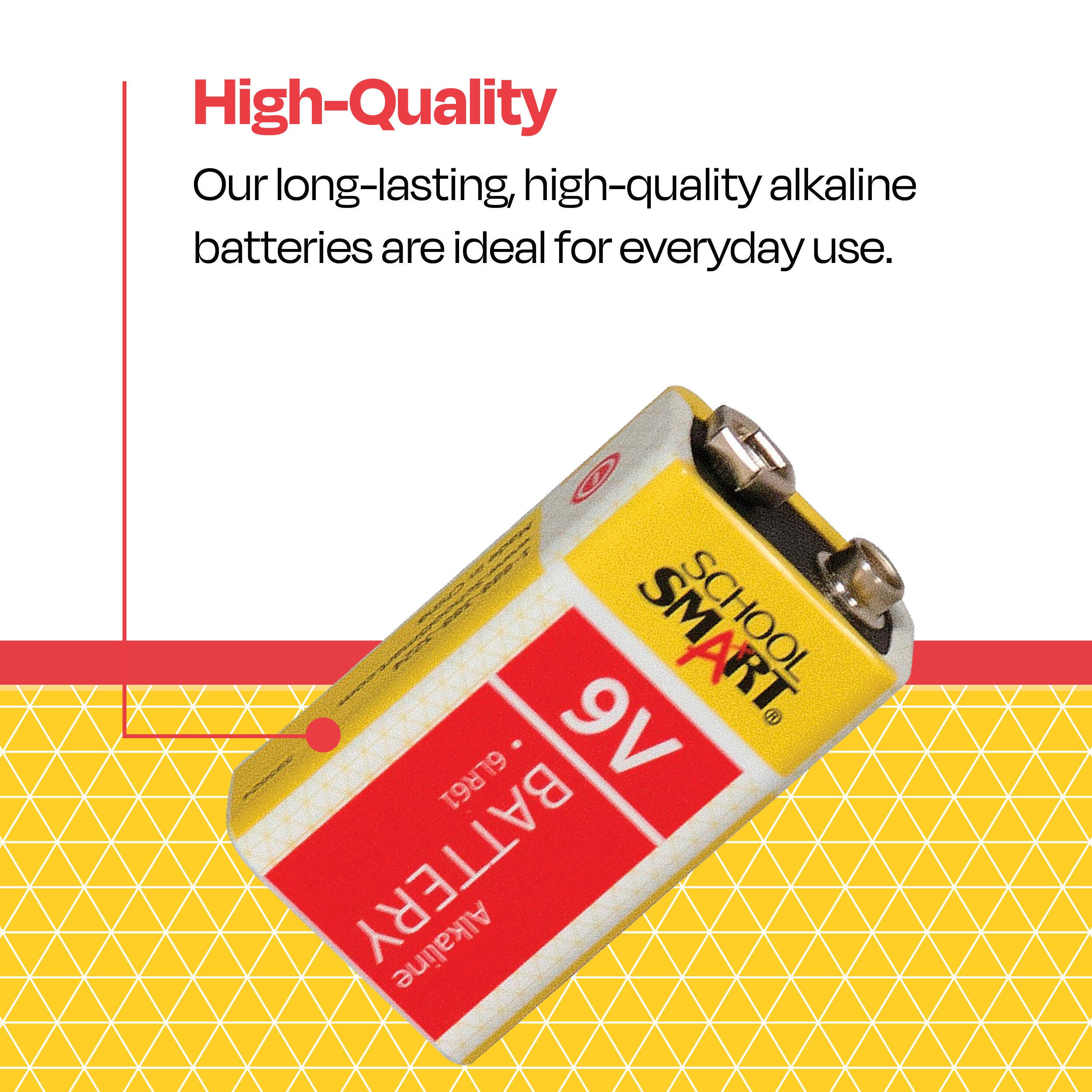 Description Our School Smart 9V alkaline battery stands up to the rigors of the classroom. Use the 9 volt battery for electronics, smoke alarms and detectors, toys, and more. Our 9V battery is priced with teachers in mind and ideal for everyday needs.Features Use the 9 volt battery at your school, office, or home This long-lasting, high-quality alkaline battery is ideal for everyday use Our alkaline battery 9V price is affordable School Smart offers other battery sizes as well (sold separately)