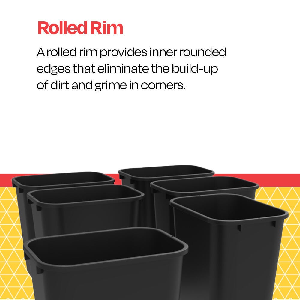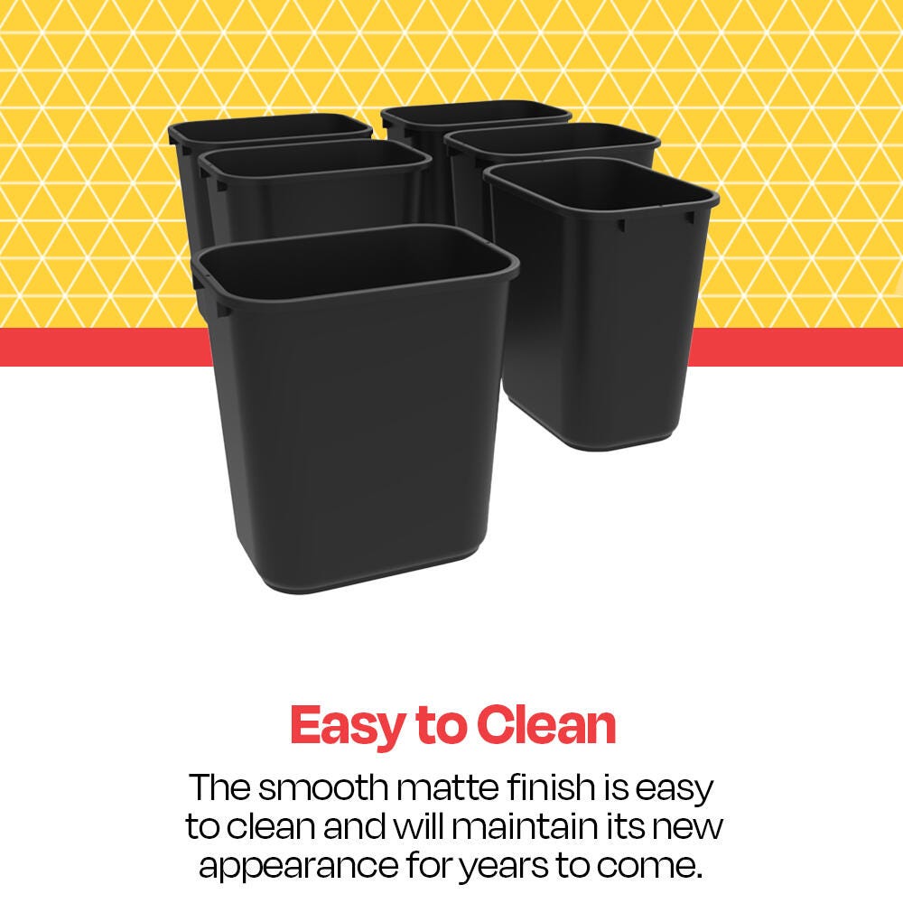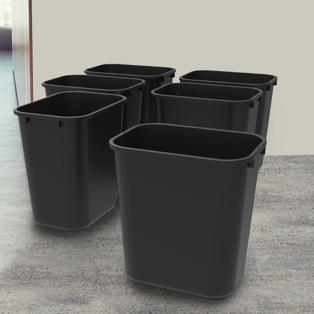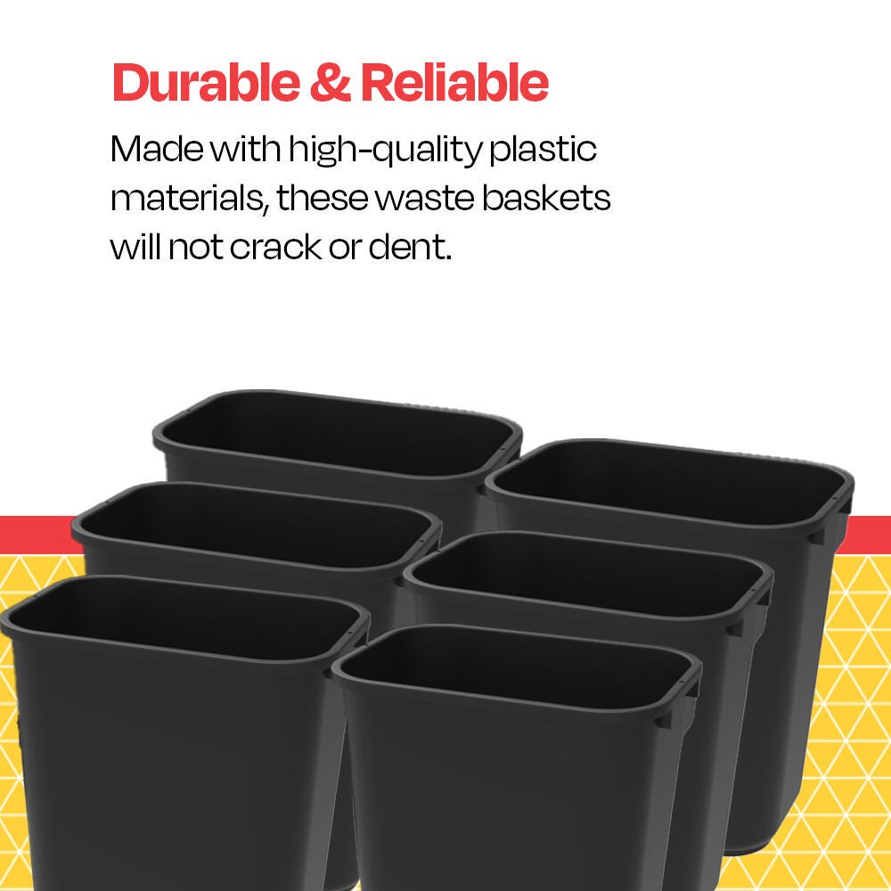 This pack of 28-quart Indoor Waste Baskets provides a versatile and space-saving solution for managing trash or recycling. The trash cans are perfectly sized to fit under a table, desk, or in a cabinet for discrete waste management or personal use. This small size is excellent for offices, bathrooms, bedrooms, dorm rooms, and other places where space may be limited. The durable plastic construction is crack-resistant and comes in a sleek black color that fits almost any space. This case contains 6 waste baskets.