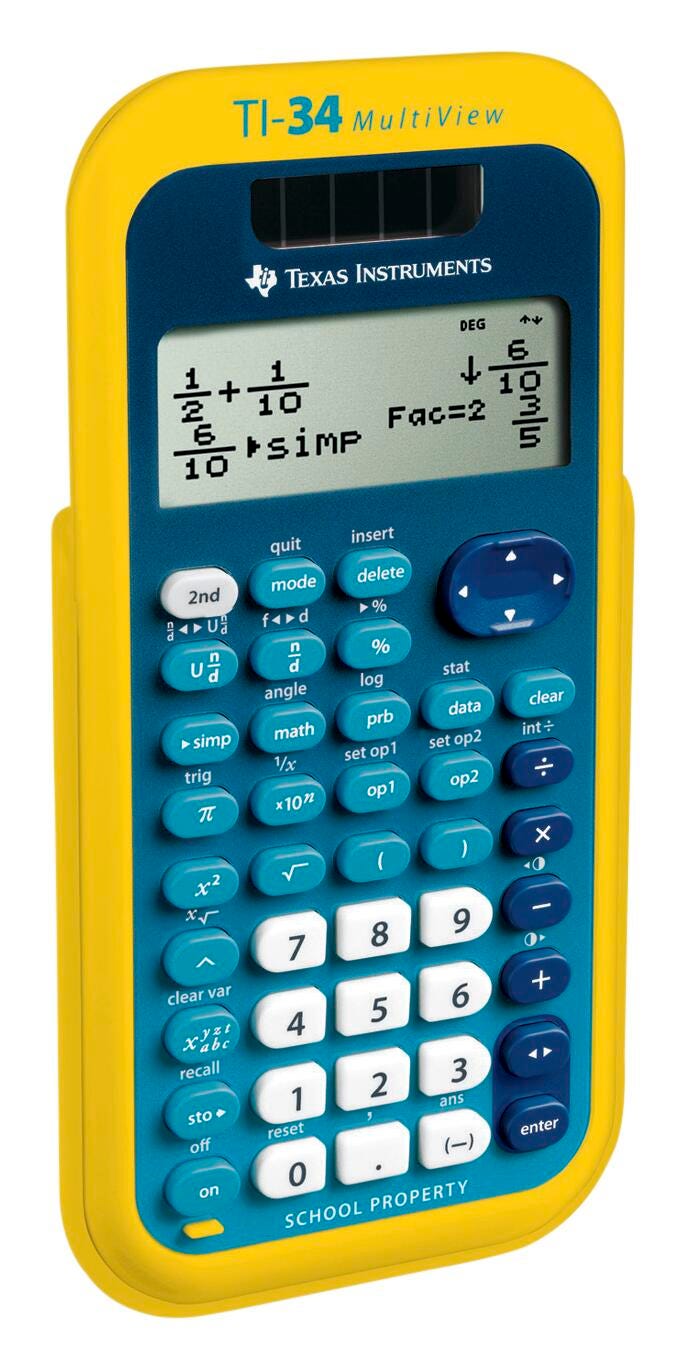 The TI-34 MultiView Scientific Calculator from Texas Instruments is the ideal choice for middle school math, Pre-Algebra, Algebra I and II, general science, and geometry. The exclusive MultiView display shows fractions as they are written on paper, and allows users to view multiple calculations on a four-line display and easily scroll through entries. The Toggle Key lets you quickly view fractions, decimals, and terms, including Pi, in alternate forms. Functions include previous entry, power, roots, reciprocals, variable statistics, and seven memories. These scientific calculators also feature user-friendly menus, automatic shut-off, hard plastic color-coded keys, nonskid rubber feet, and dual power with solar and battery operation. This kit delivers everything educators need, with ten calculators, a teacher's guide, and an educational poster.Features