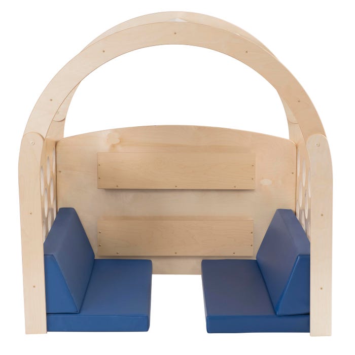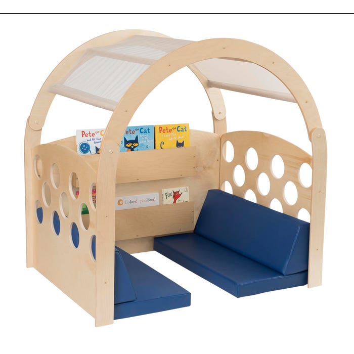 The Childcraft® Reading Nook provides a comfortable retreat for young learners to explore books and unwind. Designed for classrooms, libraries, and early learning spaces, this wooden reading nook features a sturdy frame with side cutouts for teacher visibility, two built-in bookshelves for easy access to reading materials, and a soft canopy for a calming atmosphere. The included blue seat cushions offer extra comfort, making this the perfect spot for independent reading or small group activities. This reading nook with seating comes with two interchangeable canopies. The full unit measures 49-1/2 W x 37 D x 50 H inches. Assembly required.