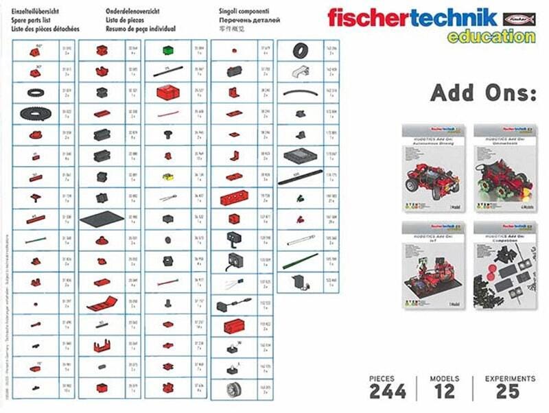 This Robotics TXT 4.0 Base Set provides the core components necessary for use in control classes: Controller, software, power supply, actuators and sensors and many basic building blocks are included here. The four separately available ADD-ON sets expand the TXT 4.0 Base Set by their respective focus and can be clearly integrated in the lower tray provided for this purpose.
