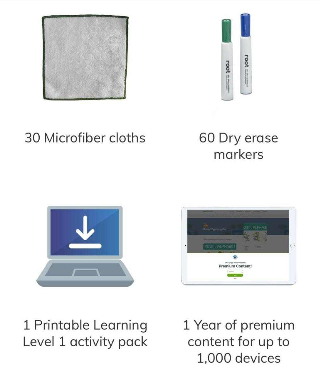 Includes: 30 Root Robots 1 Root Academy School ID (up to 1,000 iOS Devices) 1 Printable Level 1 Curriculum Guide 30 Foldout Whiteboard Grids 30 Vinyl Cling Packs for Games & Activities 30 USB Charging Cables 60 Dry Erase Markers