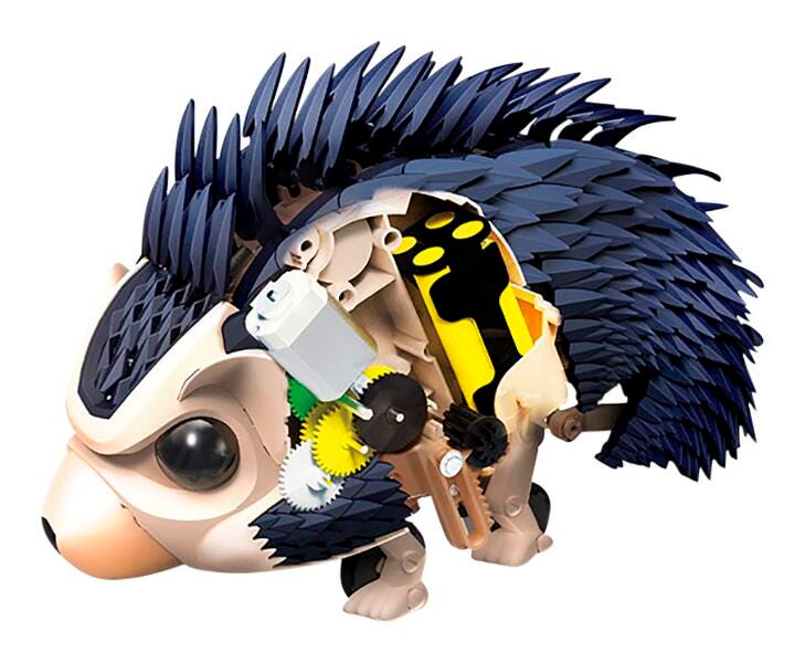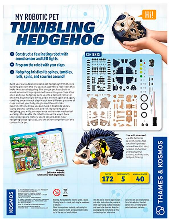 Thames and Kosmos Tumbling Hedgehog is your very own robotic pet that can be assembled using 172 pieces and programmed to entertain and respond to different commands with its built-in sound sensor. Just clap once and the hedgehog will tumble backwards, clap multiple times and the hedgehog will tumble along the count of your claps, and clap in a pattern to get your hedgehog to bristle its spines and light up the room with its built-in LED lights.
