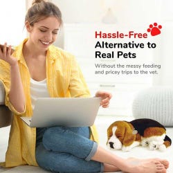 These adorable life-like animals offer a pet companionship experience for all ages, without the hassle and responsibilities of caring for a real pet! Each pet "breathes" and their 100% synthetic fur is soft to stroke as they rest in your lap. Pets will breathe continuously for approximately 3-4 months by using the alkaline D battery (included) - possibly longer should you disconnect the battery between uses. No on-off switch. Clean only with a soft cloth lightly dampened with water to keep neat and tidy. Beagle measures 9-1/2 L x 7 W x 3 H inches. Carrier box measures 11 L x 7-3/4 W x 5 H inches when flat, and 11 L x 7-3/4 W x 9 H inches with the tent up. Bed measures 13 L x 10 W x 2 H inches.