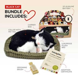 These adorable life-like animals offer a pet companionship experience that all ages can enjoy, without the hassle and responsibilities of caring for a real pet! Each pet "breathes" and their 100% synthetic fur is soft to stroke as they rest in your lap. Pets will breathe continuously for approximately 3-4 months by using the alkaline D battery (included) - possibly longer should you disconnect the battery between uses. No on-off switch. Clean only with a soft cloth lightly dampened with water to keep neat and tidy. Shorthair cat plush measures 9-1/2 L x 7 W x 3 H inches. Carrier box measures 11 L x 7-3/4 W x 5 H inches flat, and 11 L x 7-3/4 W x 9 H inches with tent up. Bed measures 13 L x 10 W x 2 H inches.