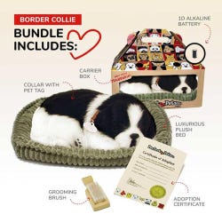 These adorable life-like animals offer a pet companionship experience that all ages can enjoy, without the hassle and responsibilities of caring for a real pet! Each pet "breathes" and their 100% synthetic fur is soft to stroke as they rest in your lap. Pets will breathe continuously for approximately 3-4 months by using the alkaline D battery (included) - possibly longer should you disconnect the battery between uses. No on-off switch. Clean only with a soft cloth lightly dampened with water to keep neat and tidy. Border collie plush measures 9-1/2 L x 7 W x 3 H inches. Carrier box measures 11 L x 7-3/4 W x 5 H inches when flat, and 11 L x 7-3/4 W x 9 H inches when tent is up. Bed measures 13 L x 10 W x 2 H inches.