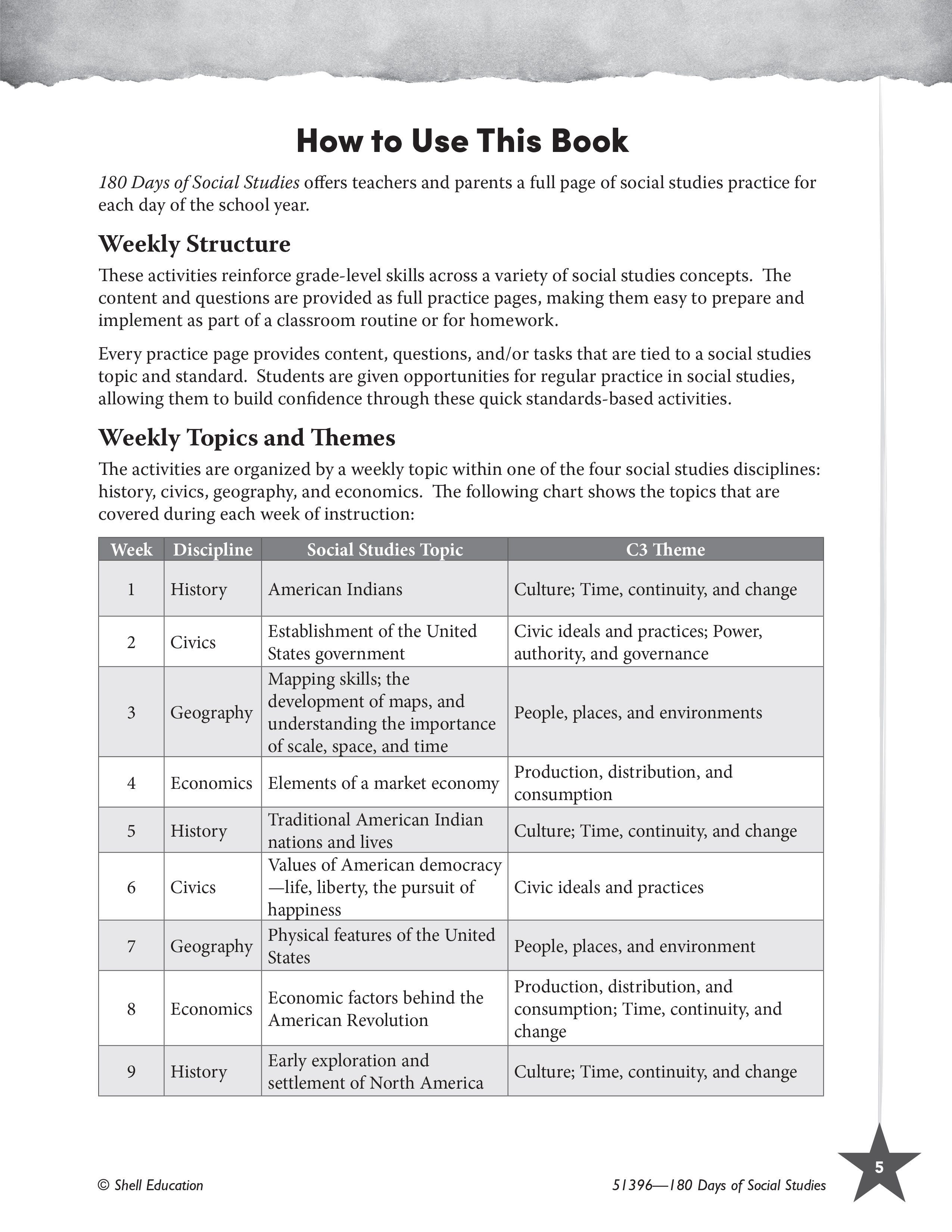 The 180 Days of Social Studies for Fourth Grade provides teachers and parents with 180 days of daily practice to build students' social studies content-area literacy.