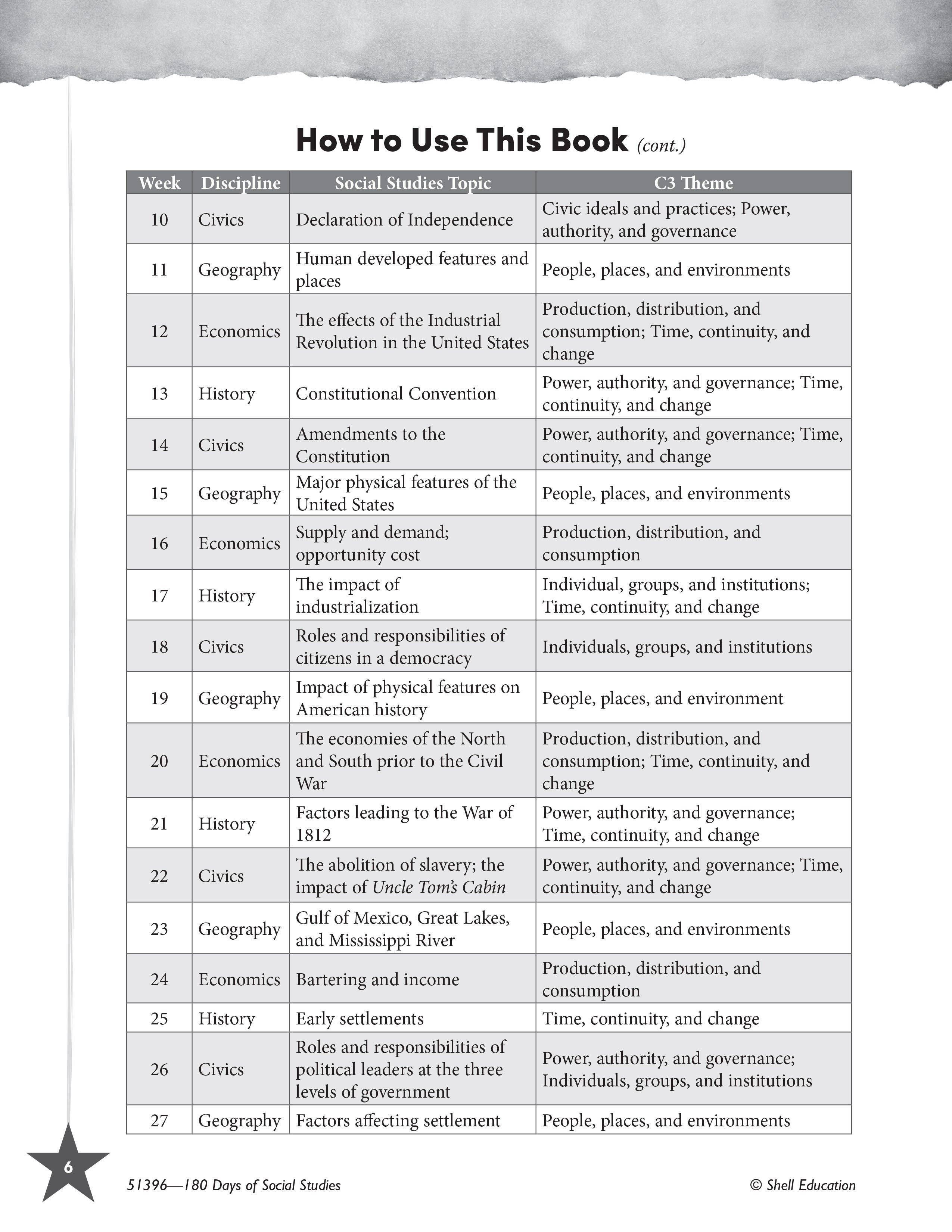 180 Days of Social Studies for Fourth Grade provides teachers and parents with 180 days of daily practice to build students' social studies content-area literacy. The quick, diagnostic-based activities support the C3 Framework and allow busy teachers to cover social studies content daily. Through these weekly units, grade 4 students will analyze and evaluate primary source documents, answer text-dependent questions, and improve their social studies knowledge, critical thinking, and reasoning skills. Each week will assess students' knowledge of grade-level social studies content, and focuses on a grade-level topic within one of the four social studies disciplines: geography, economics, civics, and history. This resource helps teachers meet the National Council for the Social Studies (NCSS) and state standards in their classrooms. With these daily activities, students will increase their social studies knowledge in no time! Digital files are included.