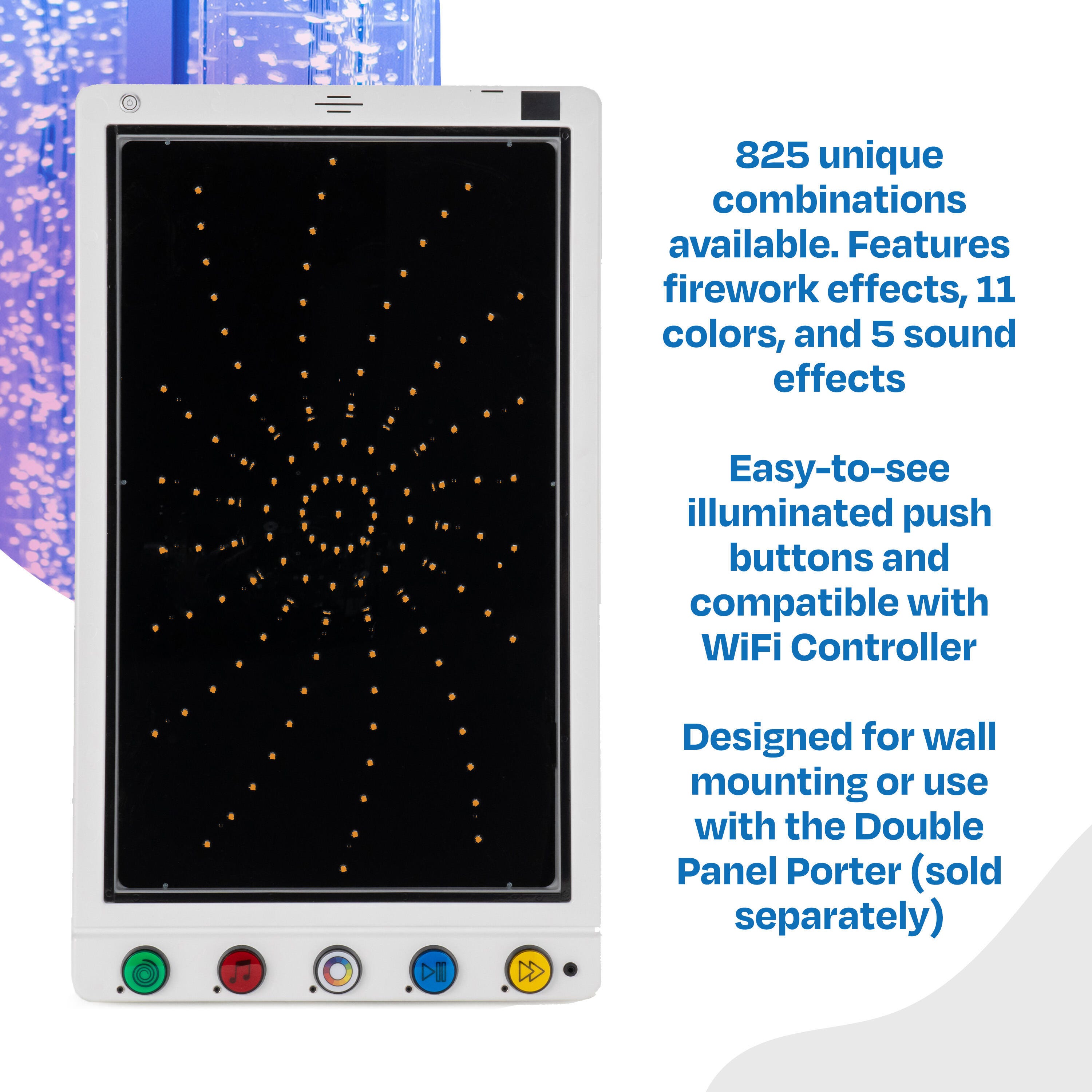 Snoezelen® Fireworks Extravaganza Interactive Panel offers a stunning visual and auditory experience, perfect for multi-sensory environments (MSEs). Users can explore and customize their sensory journey with 11 colors, 5 sound effects, and 3 speed options, creating up to 825 unique combinations. Featuring 5 breathtaking fireworks effects, including Catherine Wheel, Falling Stars, Radiating, Comet, and Strobe, this activity panel encourages interaction, visual tracking, and cause-and-effect learning. Accessible illuminated push buttons and compatibility with adaptive switches ensure inclusivity for diverse needs. This item is compatible with Snoezelen WiFi Wireless Controller item #2120147 (sold separately). We offer multiple panel designs and sizes. View the product brochure.