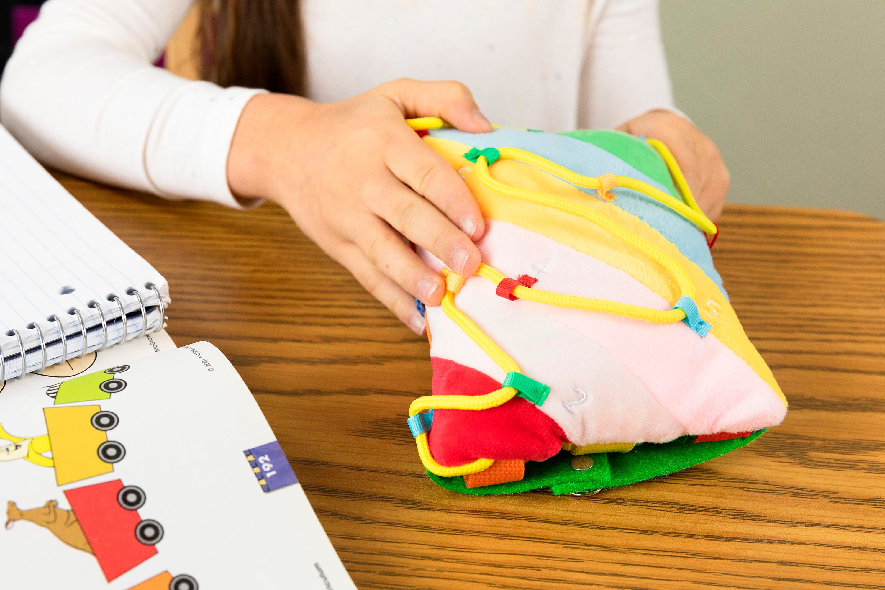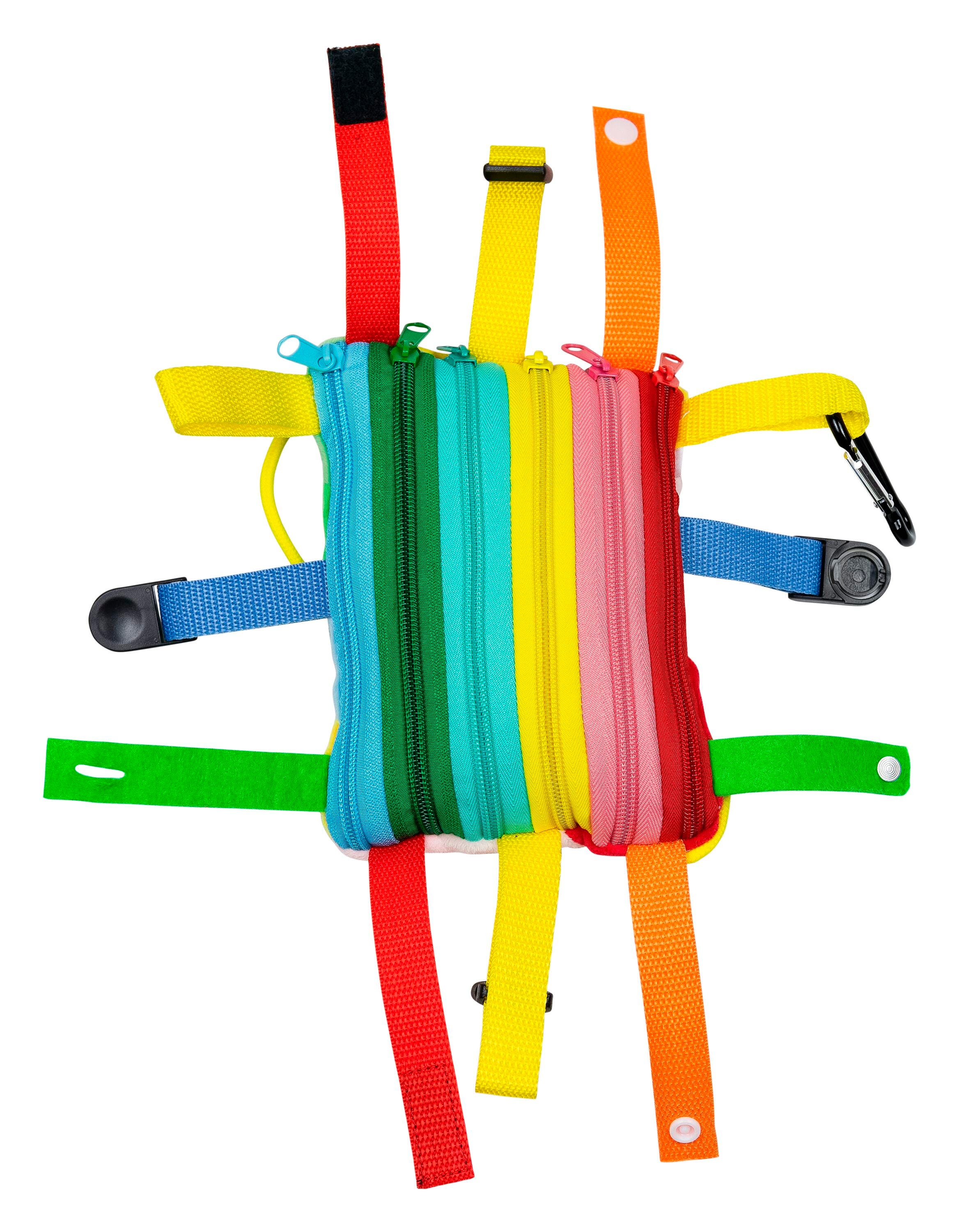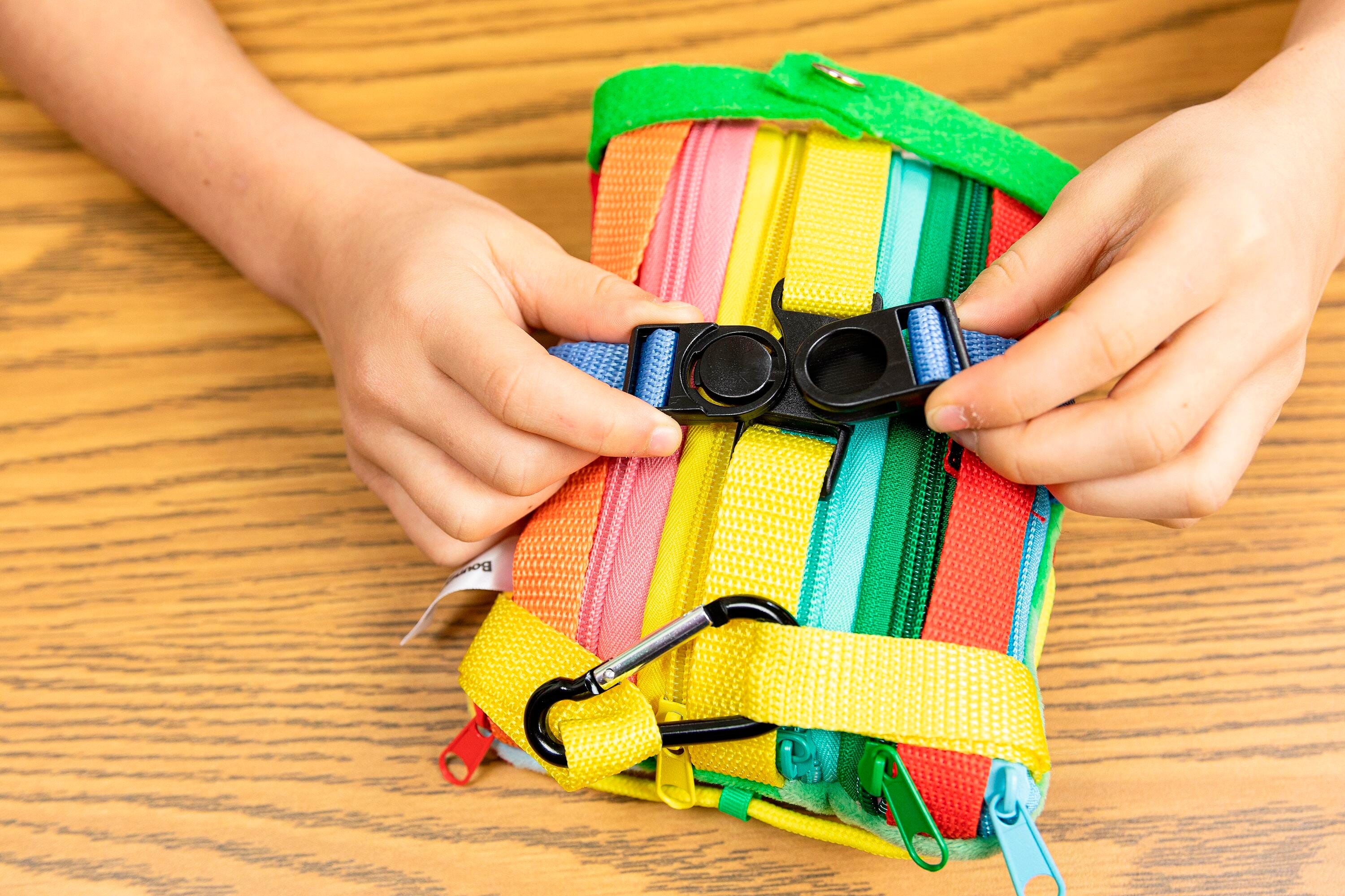 The Thingamajig actively engages children in tactile exploration through their natural fascination with zippers, buttons, snaps, and colors.