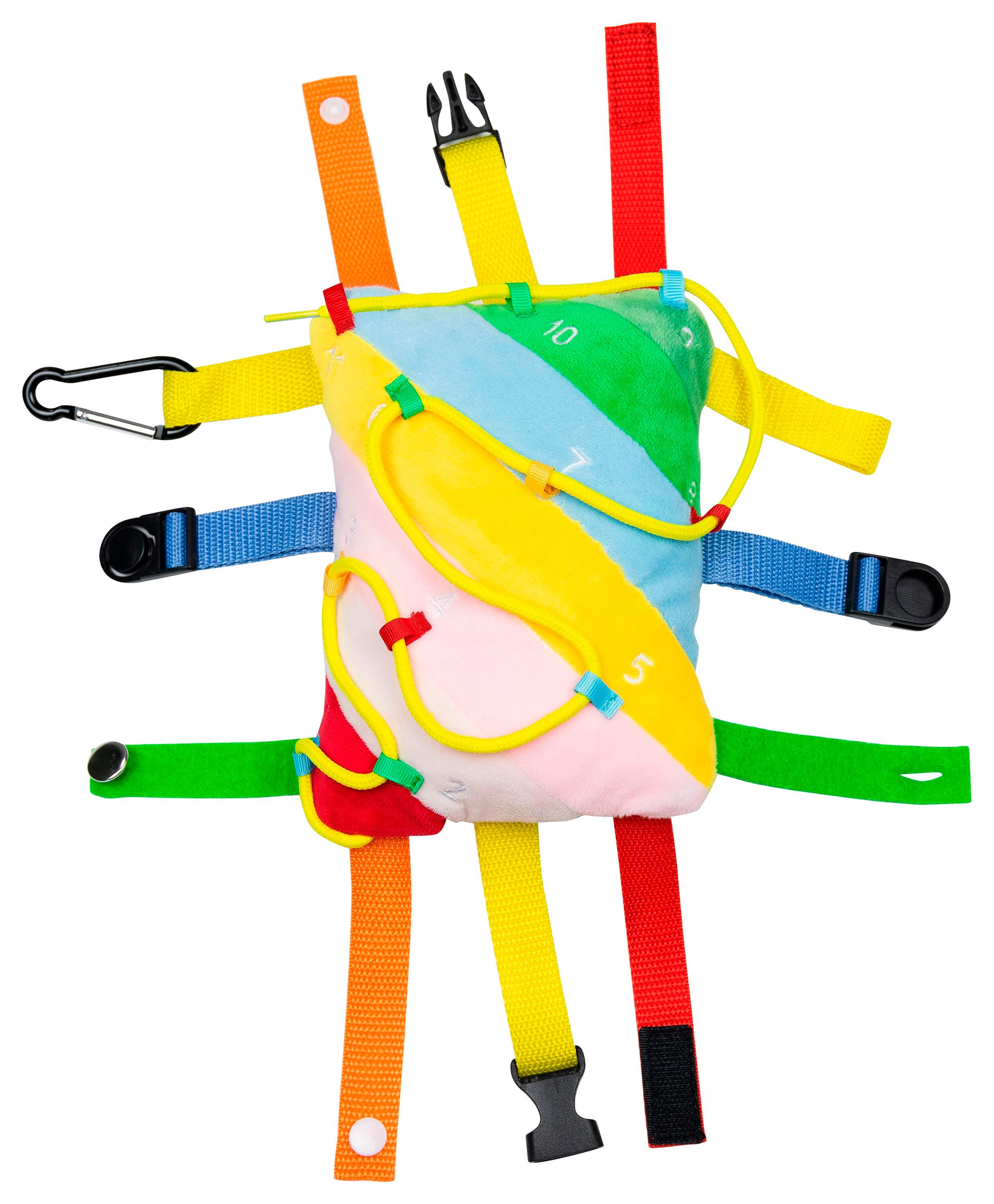• Actively engages children in tactile exploration with buttons, snaps, and zippers