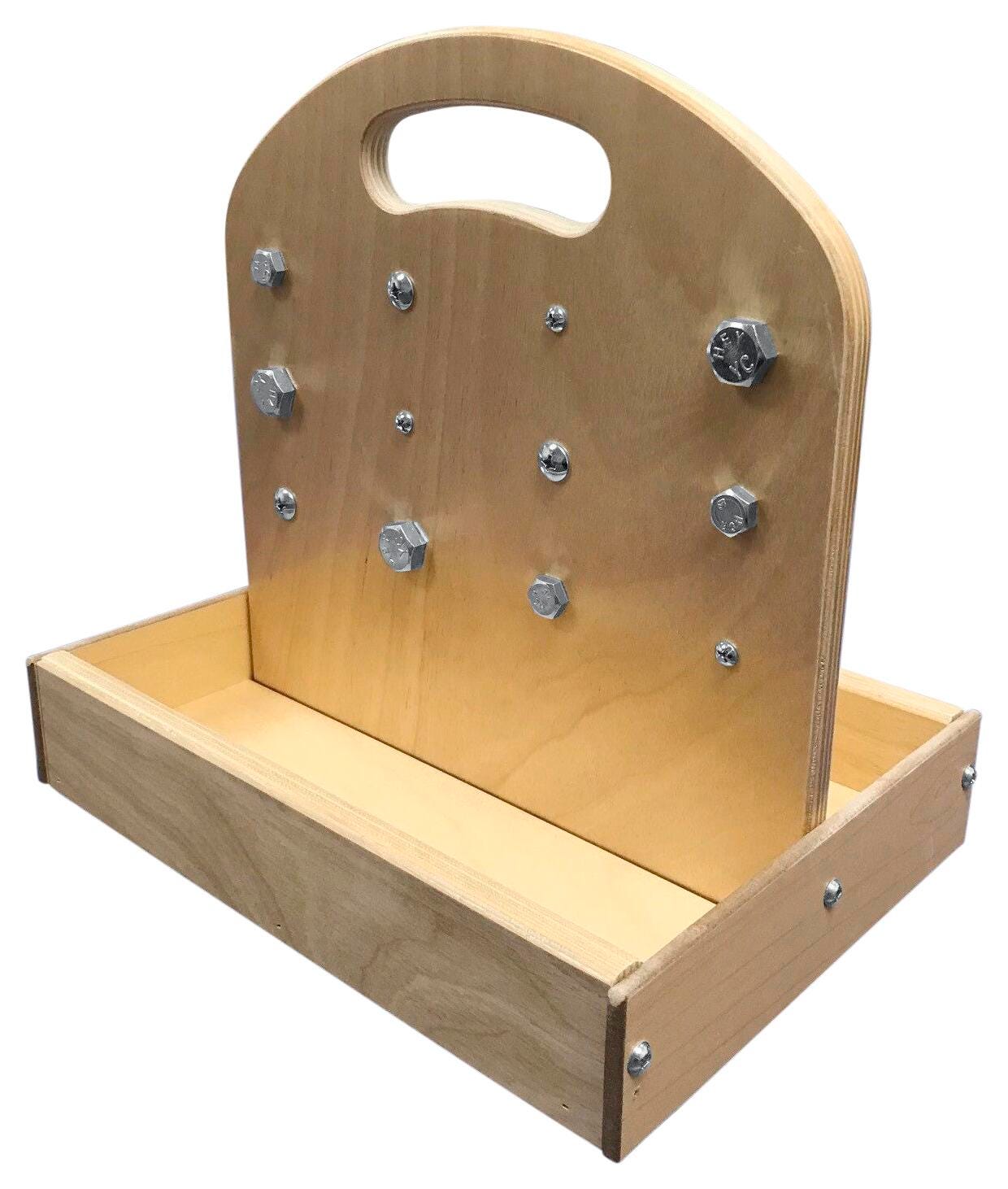 Exercise hand-eye coordination and fine motor skills with the Abilitations Hardware Dexterity Board! Board contains 12 holes that match up to different sized nuts and bolts. Match the correct nut to the correct bolt and screw it into the board. Ideal for fine motor dexterity skill practice. Board is free-standing with a tray base to collect loose pieces. Handle at top of the board allows for easy carry. Made with birch plywood, board measures 12-1/4 L x 9 W x 12 H inches. Appropriate for ages 5 years and up with adult supervision.Features