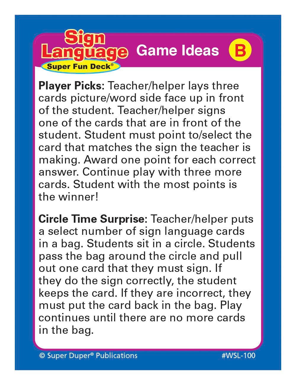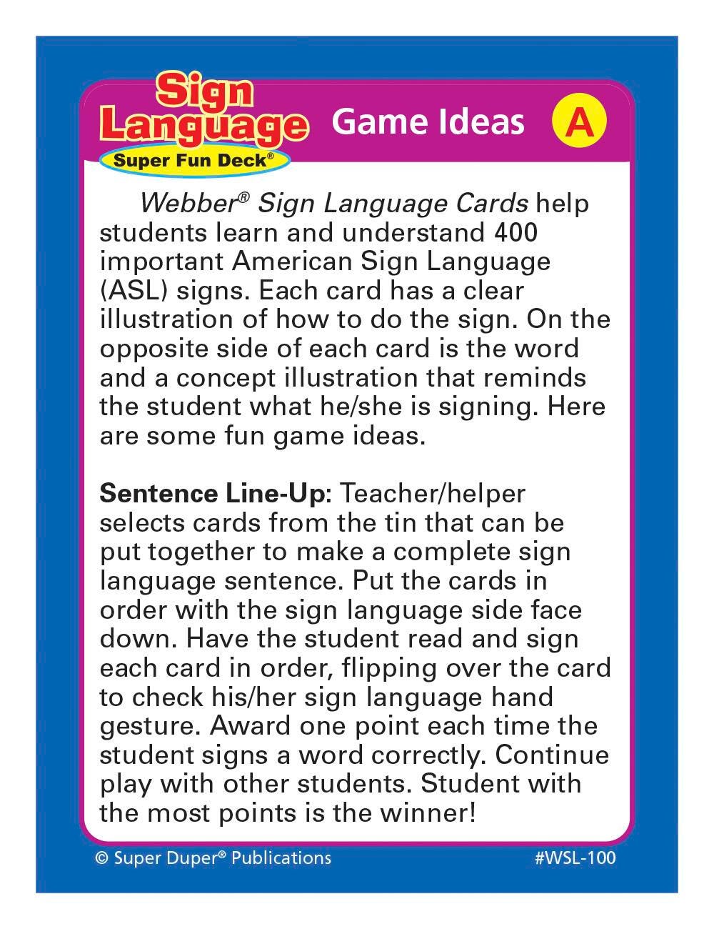 Description Use these 400 colorfully illustrated sign language cards to teach or review signs for numbers, the alphabet, family, nouns, verbs, adjectives, and more. These cards are great for any age group. One side gives the word and a picture illustration, and the other side illustrates how to make the sign. This deck includes tabs for dividing the cards into categories, game ideas for teaching and extension activities, a glossary of all signs and how to make them, all in a sturdy storage tin! The 400 signs in this deck are illustrations of the American Sign Language vocabulary. Cards measure 3" x 4".Includes: 400 Sign Language Cards 1 Storage Tin