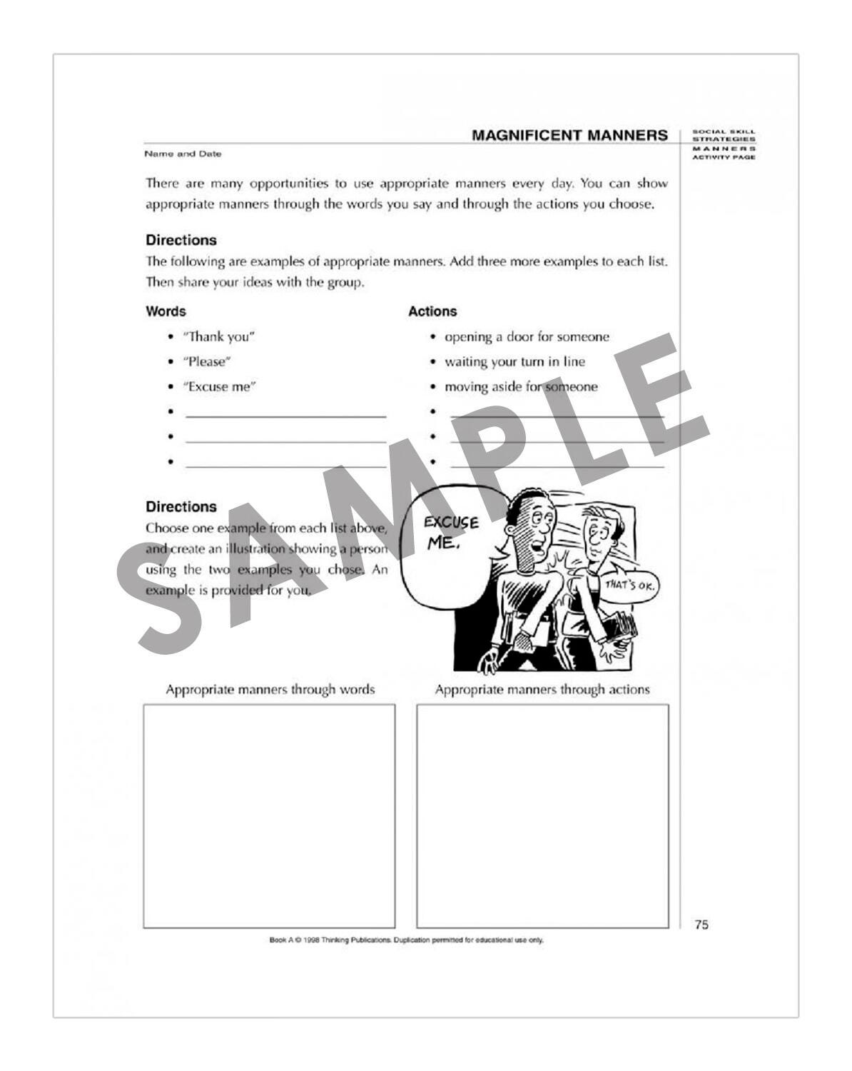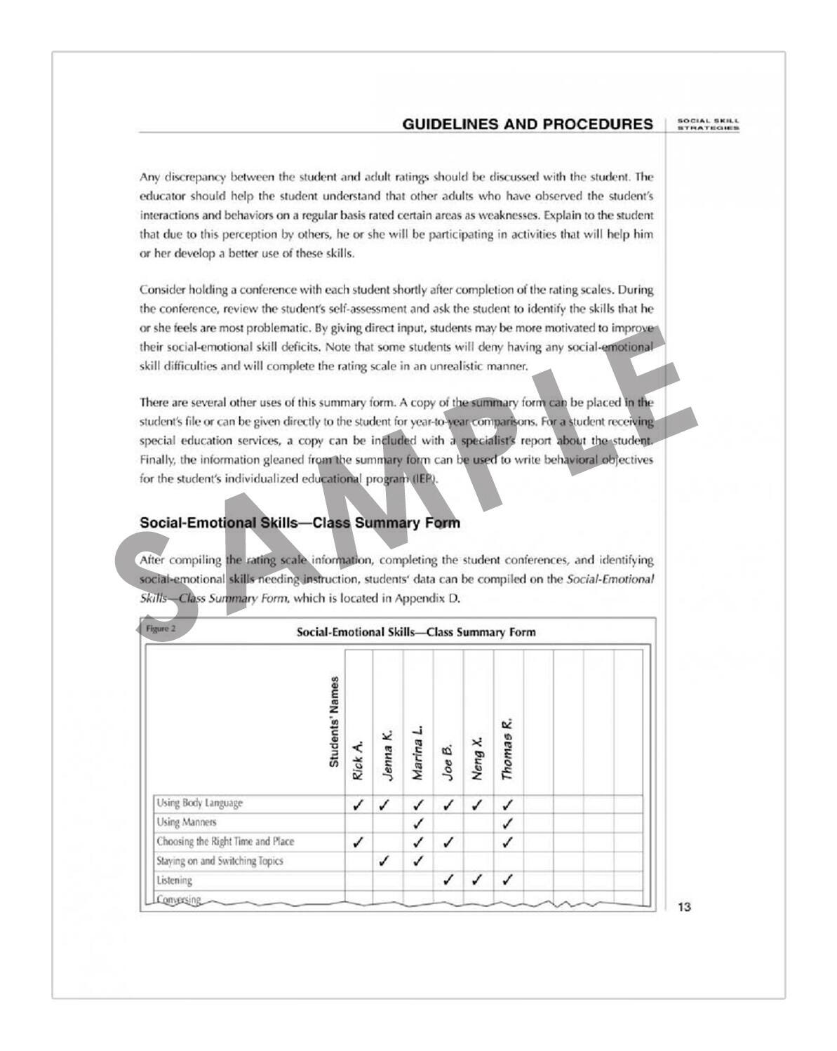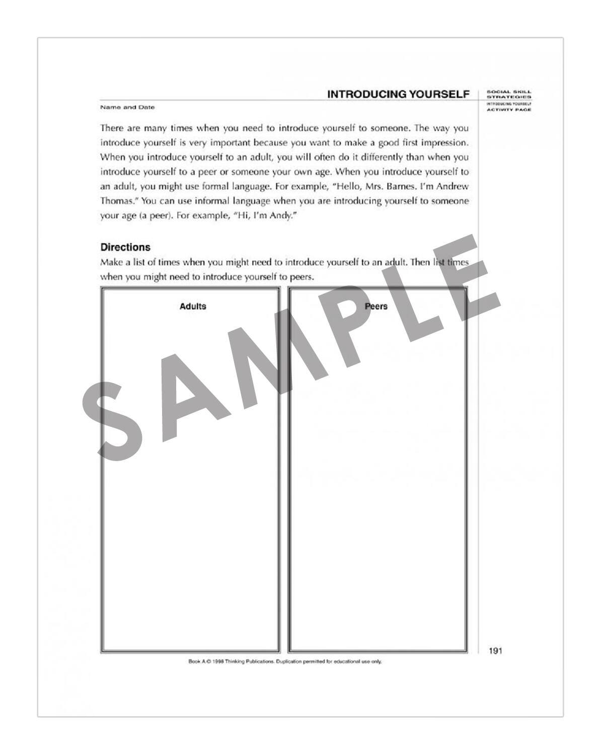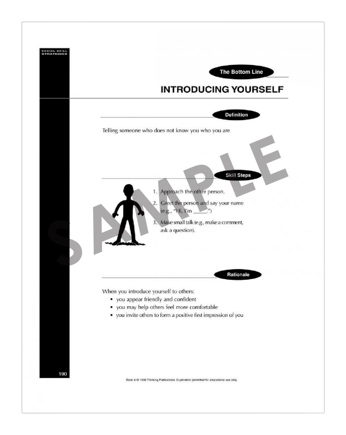 Social-Skill Strategies is a comprehensive social-emotional curriculum for use with preadolescent and adolescent students. Teach 57 social-communication skills using the reproducible student pages, structured activities, home assignments, and role-playing. Parents, case managers, or caretakers fill out the Social-Emotional Skills Rating Scale-Adult Form to provide information on 57 social-emotional skills. Students self-rate their own social-emotional skills on the Social-Emotional-Skills Rating-Scale Student Form. Students may complete activities alone or in groups. Students will become social skills "pros" after learning the lessons in these insightful books!
