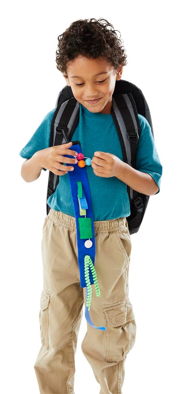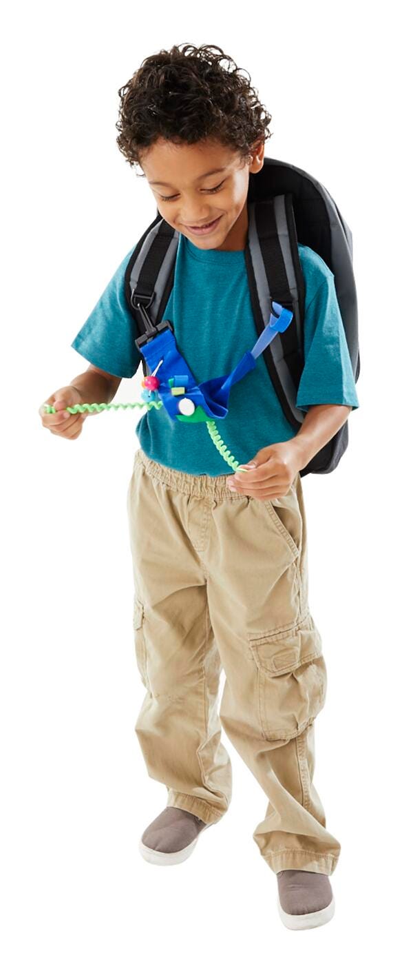 Abilitations Fidget Clip Attachment is the perfect addition to any fidgeter’s backpack! Measuring 20 inches long, the fidget attaches at the top with a clasp and features 5 fidgeting options. Slide around the marbles at the top or fidget with the ribbon loops. Push the button through the fabric tunnel or pull at the curly shoelace. Whatever your fidgety needs are, this attachment is sure to help! Entire attachment measures 20 x 2 x 1 inches and comes in blue. Spot clean only. Appropriate for ages 4 years and up.