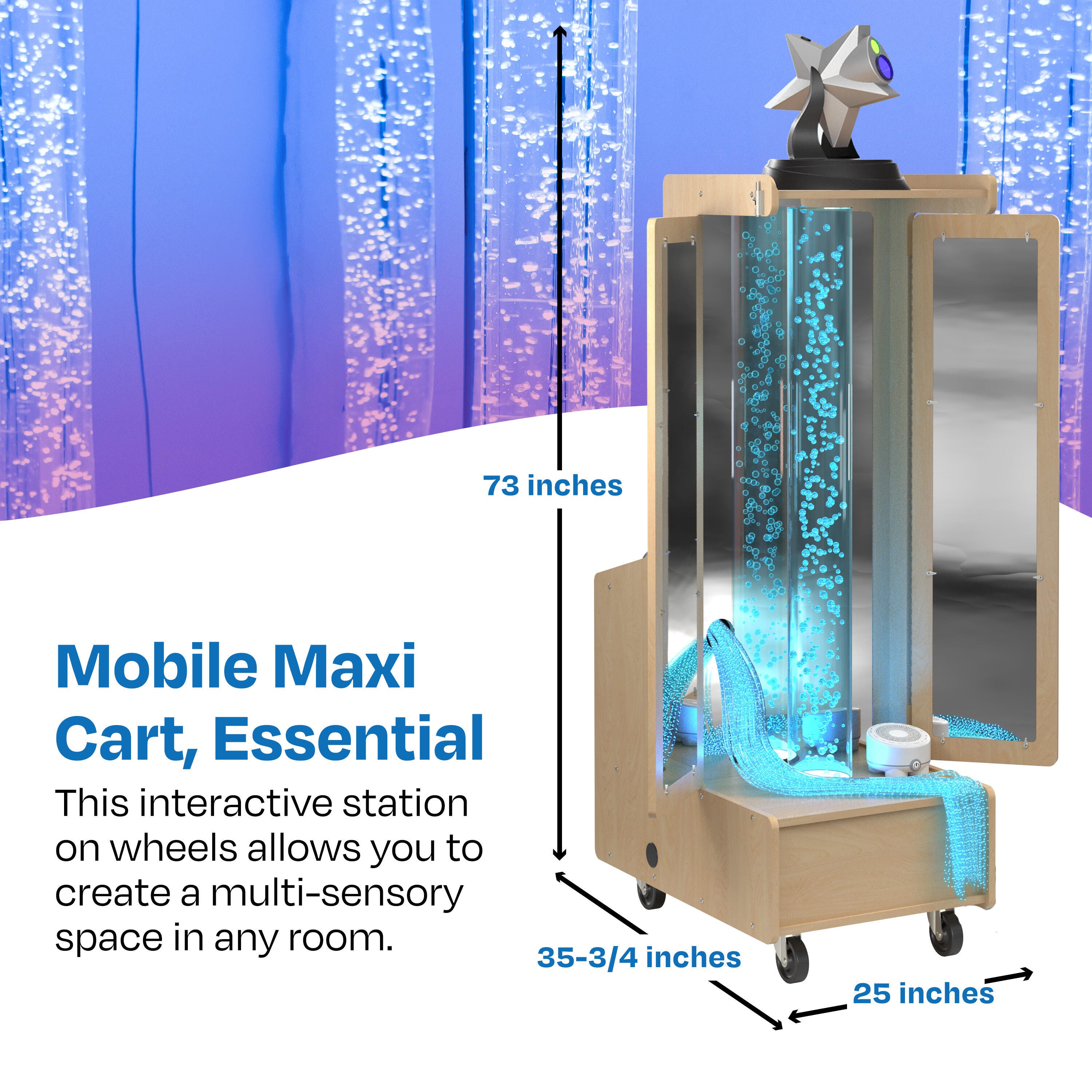 Snoezelen® Mobile Maxi Cart brings a multi-sensory experience wherever you need it, suitable for all ages and abilities. Don’t have space for a permanent sensory room? No problem. This portable sensory cart on wheels features a full sized bubble tube, shatterproof mirrors, an interactive fiber optic light spray, and projector. The lockable cabinet in the back provides secure storage for accessories. The mirrors expand and enhance each visual sensory experience without taking up extra room in storage. Large locking caster wheels and a handle allow for easy maneuverability throughout any space; move the cart from one corner to another or from room to room as needed. We offer a full range of Snoezelen Mobile Cart options. View the product brochure.