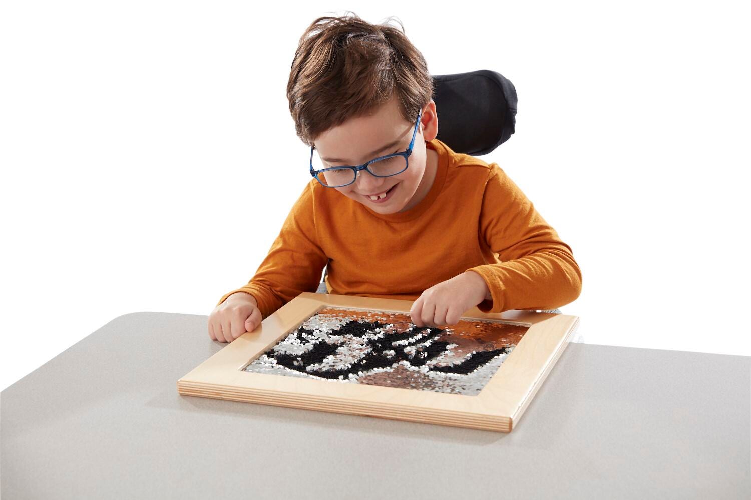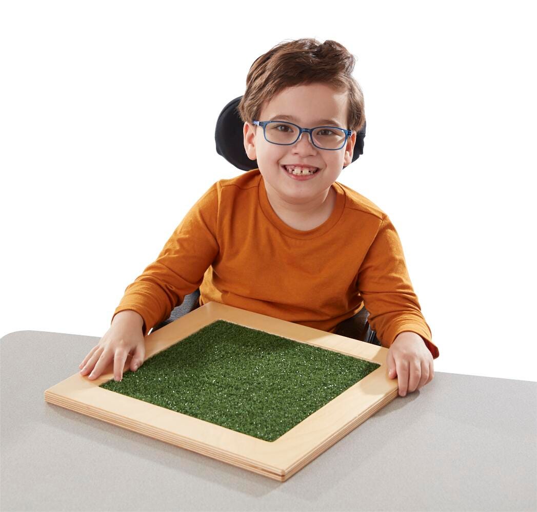 Description Abilitations Tactile Sensory Panels are an effective way to stimulate the senses by sight and touch. Smooth and soft surfaces like the carpet and cork are soothing to the touch. Hook and loop and turf grass are scratchy and rough. Mirror and sequin surfaces are visually appealing as well as inviting to touch. Each panel measures 15 x 15 x 3/4 Inches. and are not designed to be hung from a wall.Features Frames are made with smooth birch wood Assists and encourages motor skills and brain development Mirror assists with self-recognition and expression