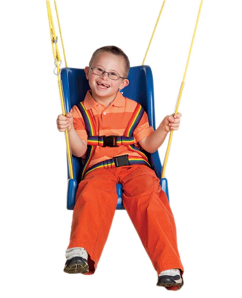 This Skillbuilders Special Swing is made of high-density polyethylene, a strong but comfortable plastic. Seat comes with a pommel (abductor to keep legs separated), a safety harness with snap buckles and adjustable ropes. Rope lengths adjustable to fit frames up to 10' high (may be used on any swing set). This child-size swing measures, 11 W x 8 D x 24 H inches and has a maximum weight capacity of 75 lbs. Swing and ropes set only. Headrest not included.