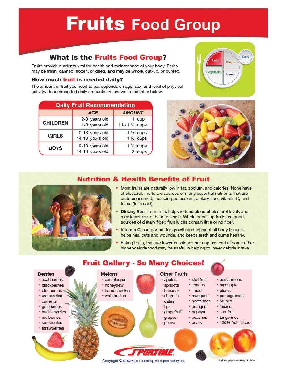- Fruits food group learning guide is an excellent nutrition education teaching aid to use alone or conjoined with other MyPlate or food-related Sportime Visual Learning Guides (sold separately)