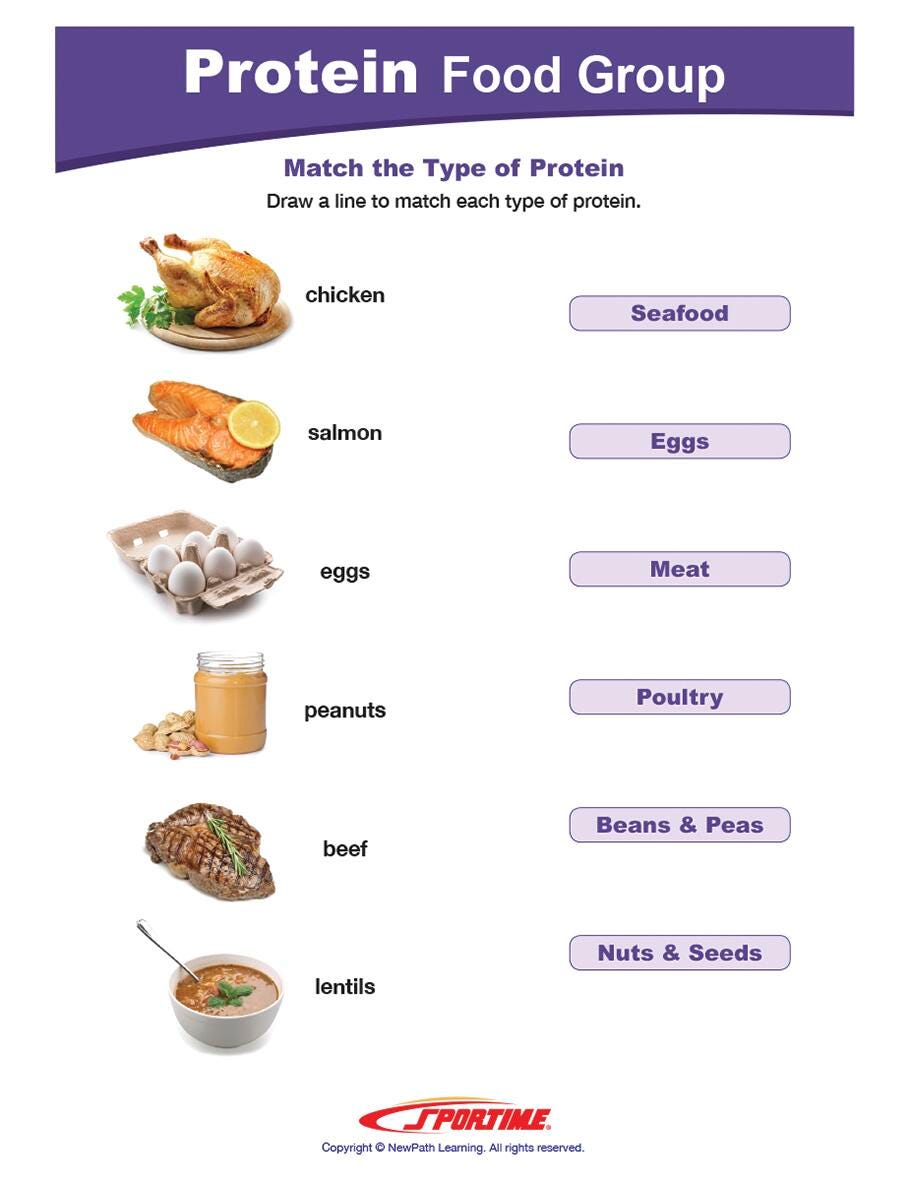- Protein food group learning guide is an excellent nutrition education teaching aid to use alone or conjoined with other MyPlate or food-related Sportime Visual Learning Guides (sold separately)