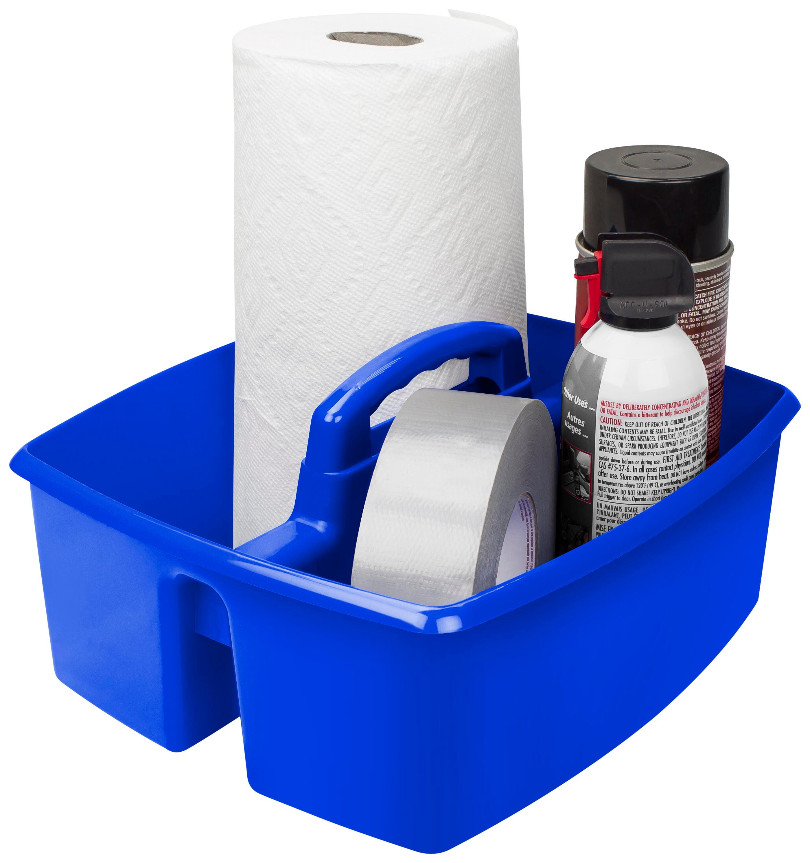 Compile your supplies (and take them where you need them) with a Storex Caddy. This large caddy has two large compartments to store art supplies, washing accessories, or anything else you need to keep handy. A large comfort grip handle provides easy handle for all ages. Both of the interior compartments measures 11-1/4 L x 4-1/4 W x 4-1/2 D inches. Durable, drop-resistant plastic is also completely washable and dishwasher safe. Sold as pack of 6 (all in blue color). Colors may vary.Features