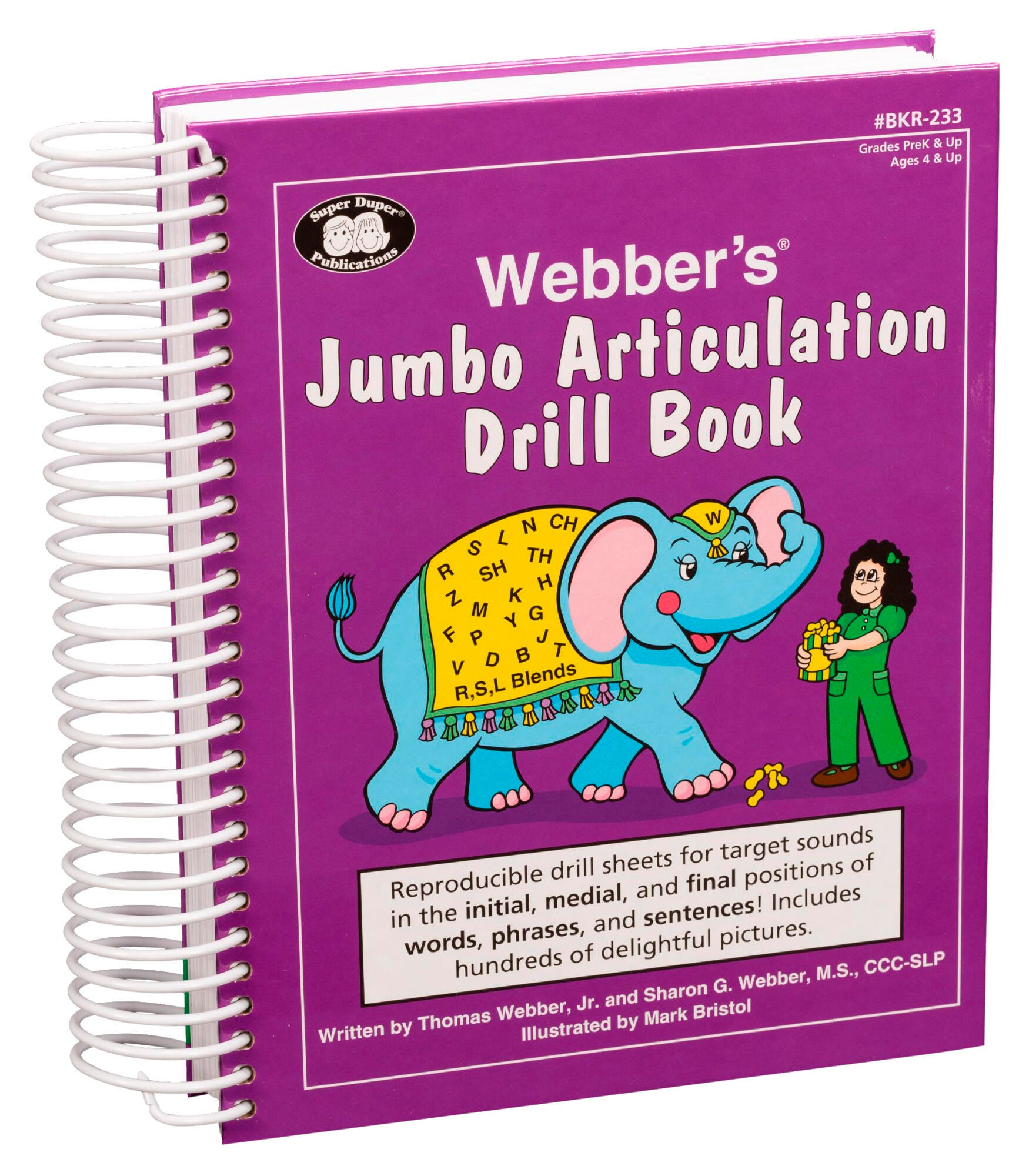Is there any other reproducible drill book that gives you 1,710 articulation word-pictures plus thousands of individual words, phrases, and sentences? The Jumbo, Huge, Immense, (did we say really BIG?) Webber's Jumbo Articulation Drill Book has everything you need! Save countless hours searching for therapy pages and use that time to teach. This unrivaled comprehensive volume has word lists, pictures, phrase lists, and sentences in initial, medial and final positions for these sounds: R, S, L, (R, S, L Blends, initial only), Z, SH, CH, TH (voiced and unvoiced), F, V, K, G, P, B, T, D, J, H, M, N, and Y. 6,420 target words! 3,120 phrases! 3,120 sentences! 1,710 delightful illustrations with open-ended instructions on all worksheets. Record data in boxes provided. Articulation Drill Record Form, Progress Chart, Homework Helper Note, Positive Awards. Spiral-bound. Hardcover.Features