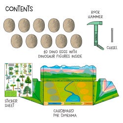 This kit comes with 10 dino eggs for you to dig into and discover 10 different dinosaur figures. Once you’ve excavated all the dinosaurs, assemble the cardboard diorama and set up your very own dinosaur museum exhibit! Place the dino figures and prehistoric plant stickers in their spots along the prehistoric timeline.Features