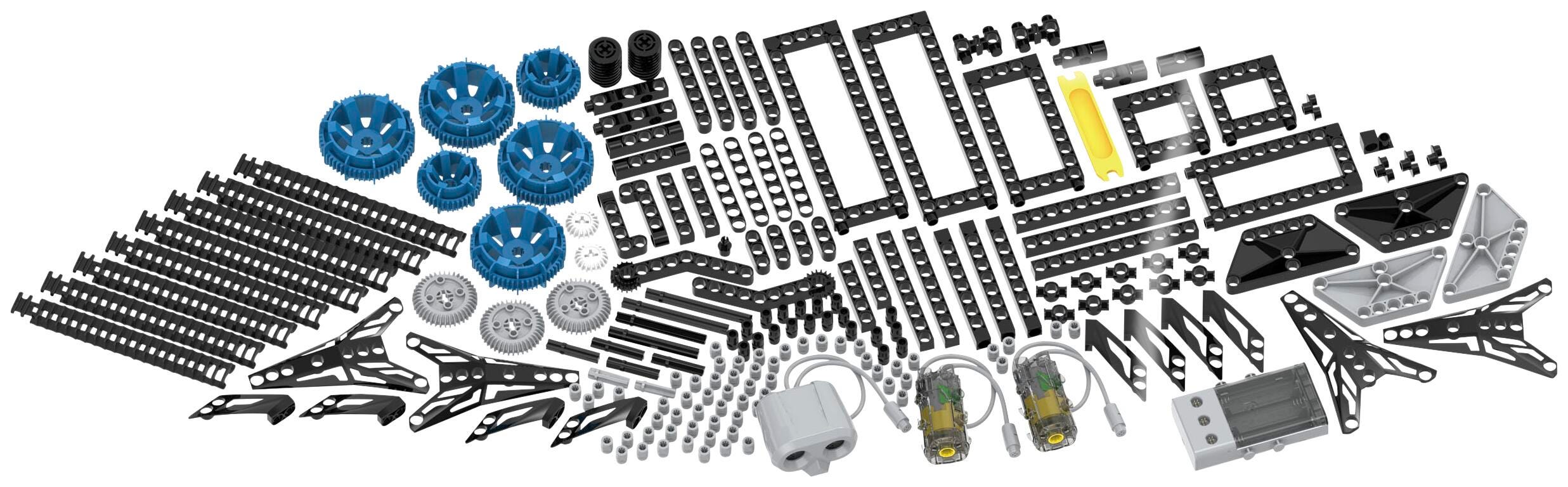 1 each, battery box, plug, sensor, 80 pins, 5 converters, 10 connectors, 35 rods, 6 frames, 4 plates, 2 crankshaft gears, 10 axles, 5 gears, 2 worm gears, 6 washers, 1 pin lever, 8 belts, 6 wheel frames, 12 body pieces