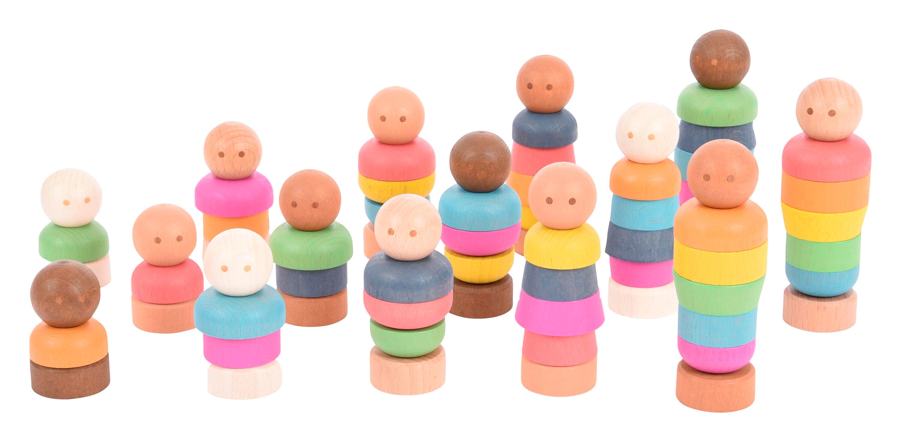 Use this set to open discussions about inclusion and diversity through roleplay. These dolls are designed to easily mix and match, with various skin tones to represent everyone in the playroom, childcare center, or classroom. Use these colorful figures for imaginative play, color recognition, and sorting. Children can improve their fine motor and descriptive language skills as they build new figures every time they play. For ages 4 years and older. Each head is sized 1-3/10 inch diameter. The size of each body ranges from 2-1/5 inches H, 2-4/5 inches H, 3-3/10 inches H, 3-9/10 inches H and 4-1/2 inches H, depending on the figure.Features