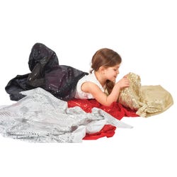 Sequins add sparkle to creative play! Four pieces of sequined, lightweight material will take imagination to the next level. Each piece is soft, sparkly and bright and comes in four colors: red, gold, silver and black. The possibilities are endless – use for role play, drape over some chairs to create a quiet space, use to enhance music and movement. Or simply use for textural and visual stimulation. Each piece measures 3-1/4 x 3-1/4 feet.