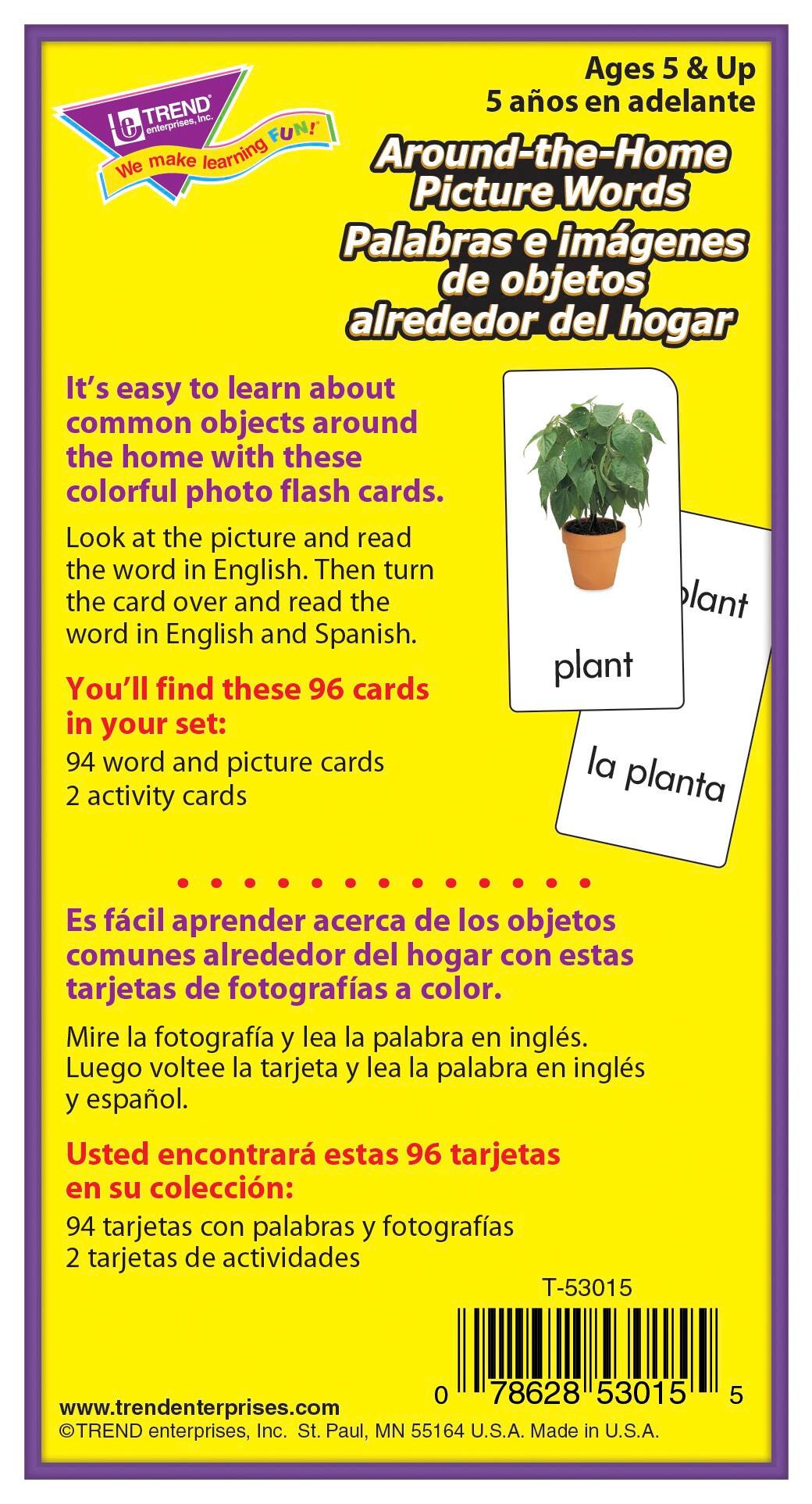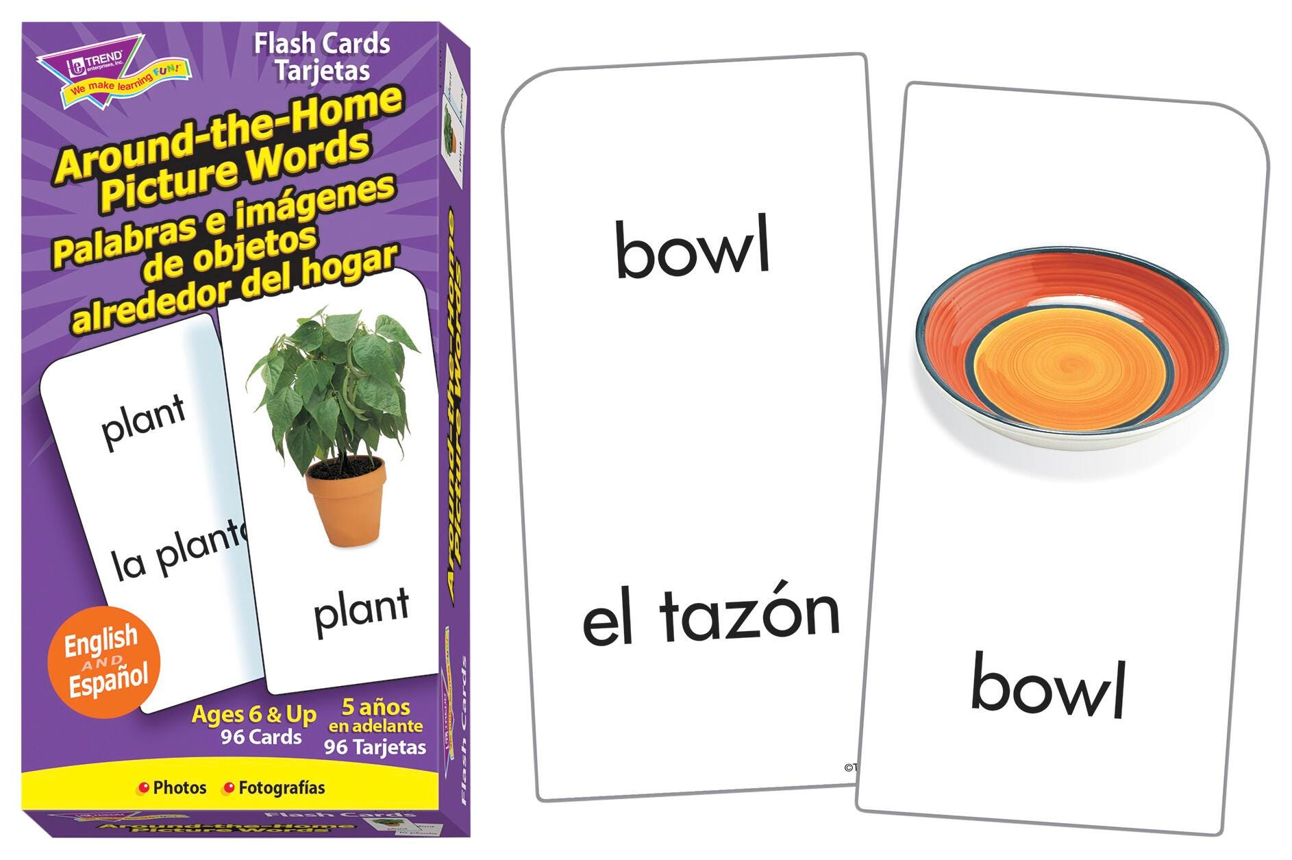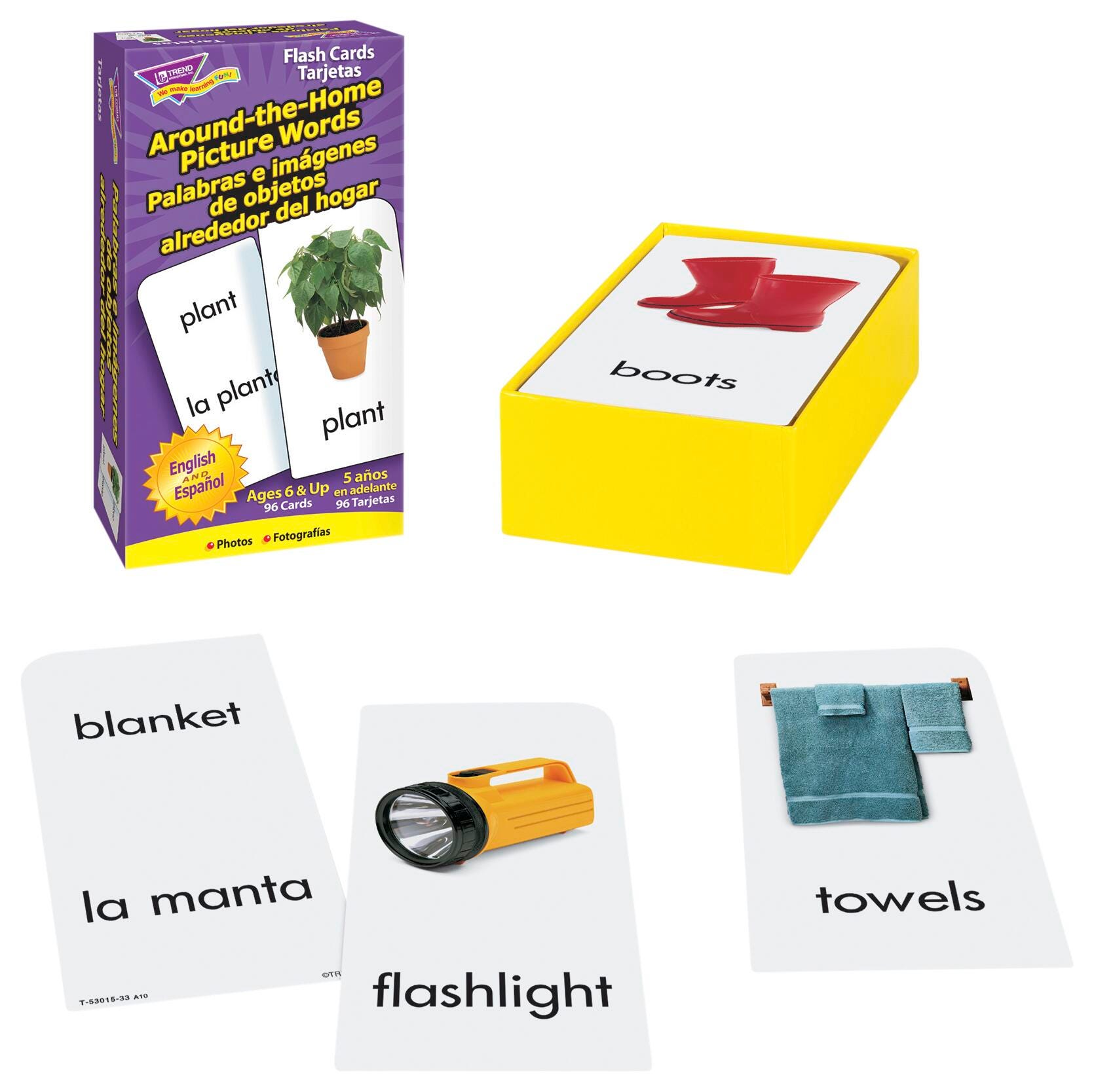 Photographed image of common household object at front of each flashcard provides easy, real-life clue for English and Spanish word recall on backside