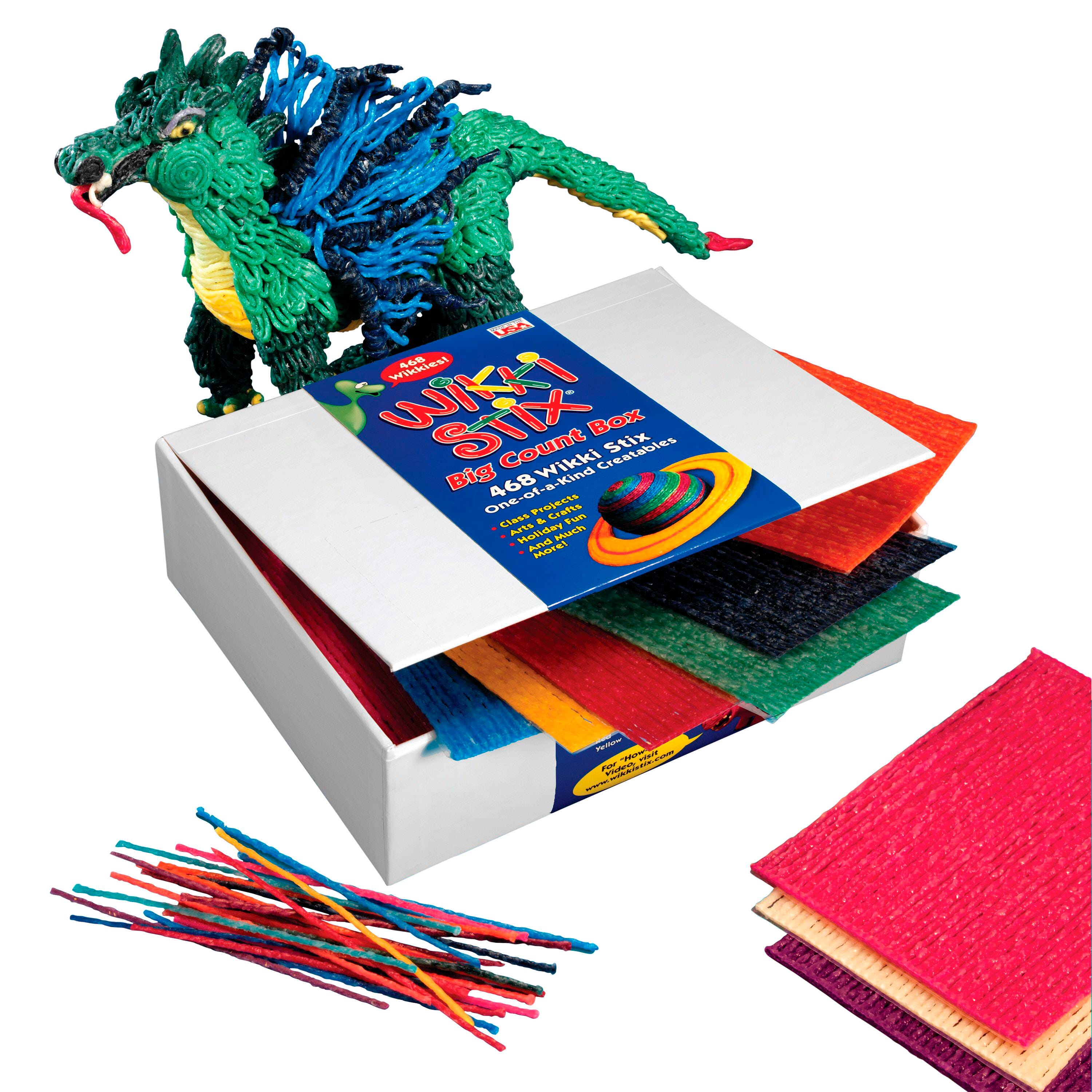 Wikki Stix are 6 in waxed infused yarn that is soft and pliable. They can be cut with scissors and bent easily into any shape for hours of creative fun. Non-Toxic Wikki Stix stick to each other and other surfaces, and are effortlessly removed without permanent residue. Reusable cords won't break, stain, melt or freeze. Make yarn-type paintings or outline letters, numbers and maps. Twist into 3-D sculpture. Pack of 468, 6 each of 13 colors. Packed in handy storage box and includes idea booklet and project sheets.Features